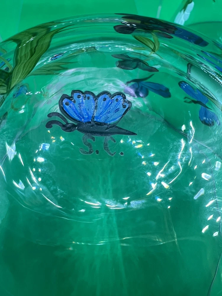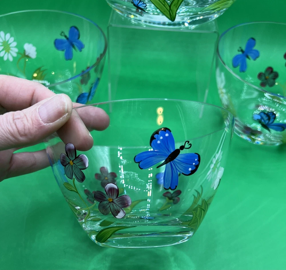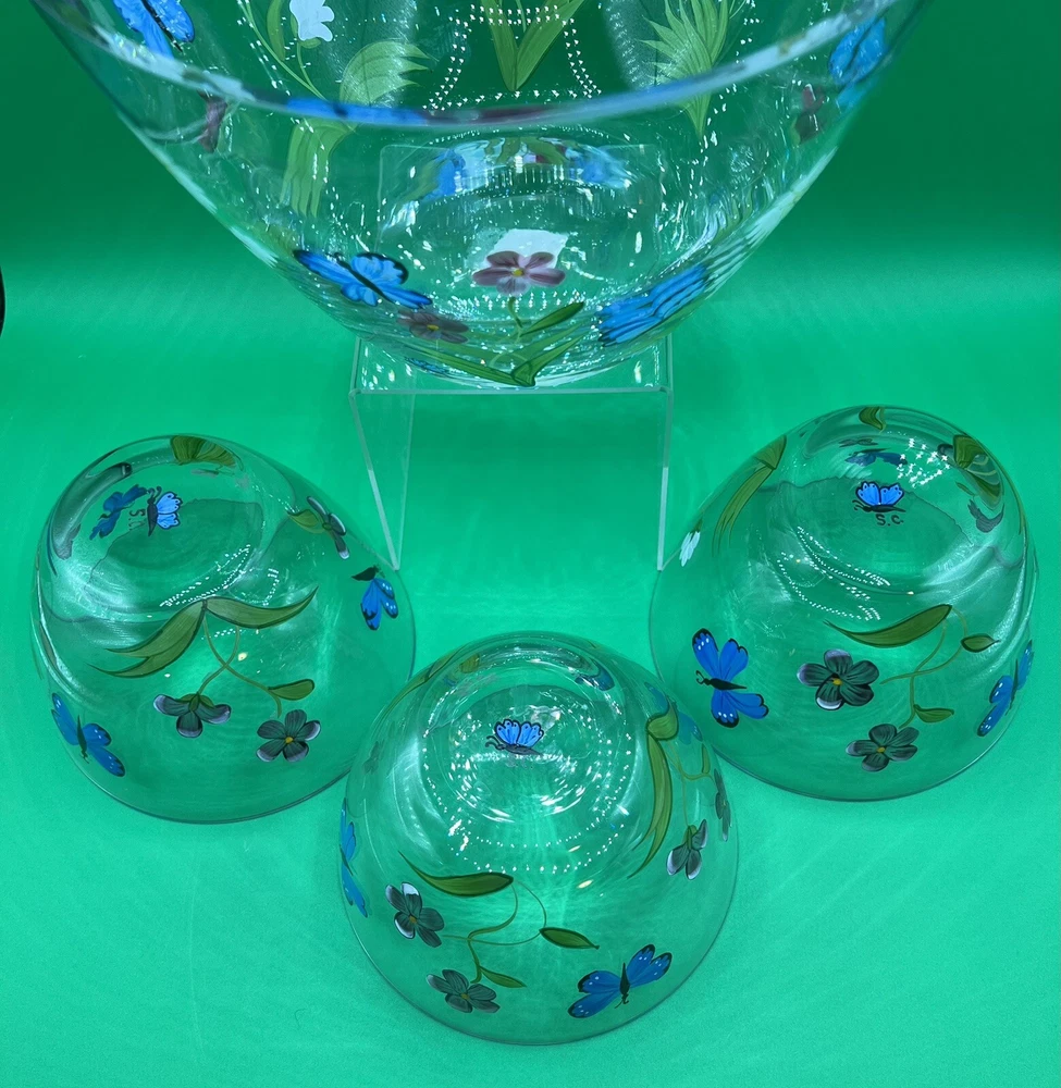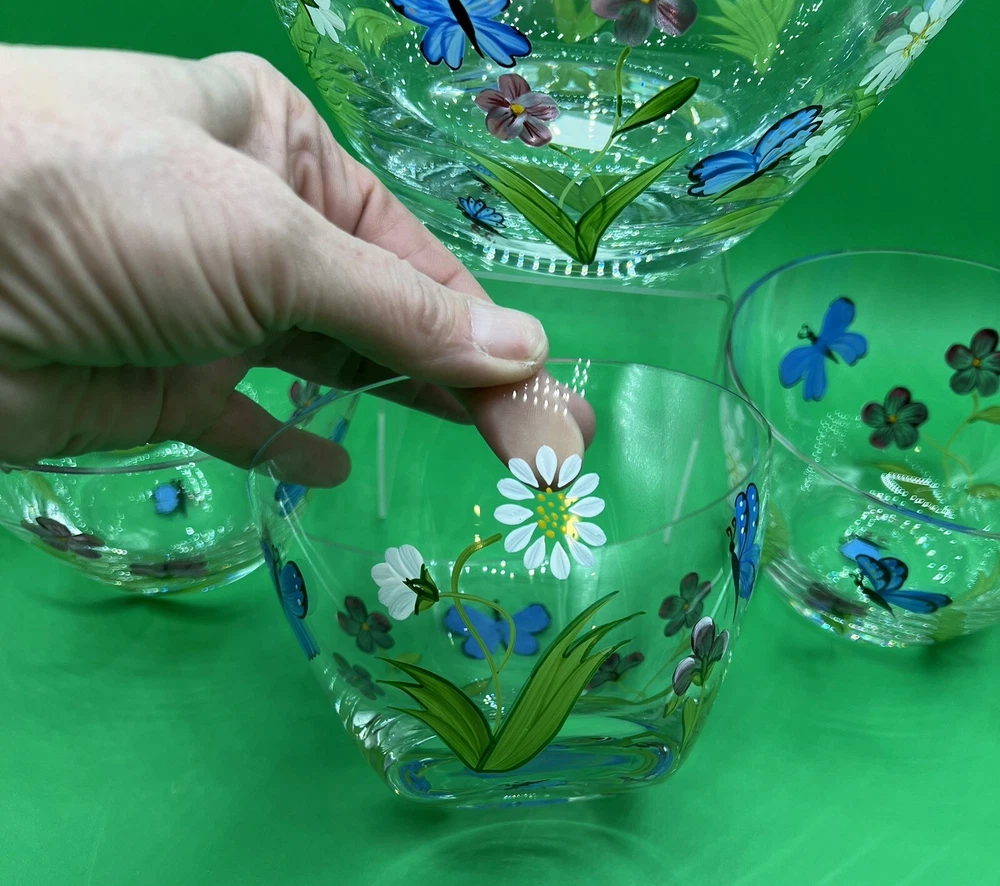 The Lenox Butterflies and Blossoms Salad Glass Bowl set includes a 9-inch hand-painted signed by artist salad bowl along with three additional 5.5” serving bowls. The design features a multicolor pattern of flowers and butterflies, creating a vibrant and elegant look. Made of glass, this round bowl set is perfect for serving salads or other dishes, adding a touch of beauty to any dining table. The hand-painted details give the set a unique and artistic appeal, making it a charming addition to any collection.