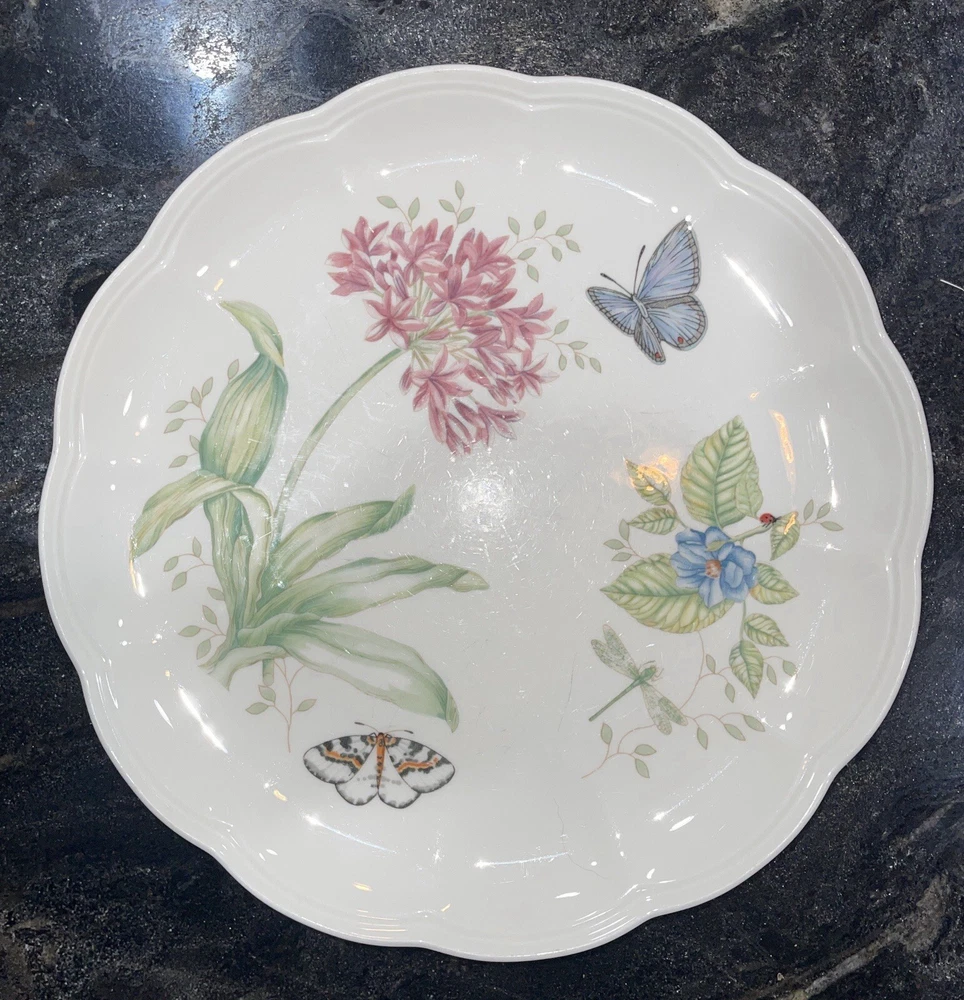 ** There are 9 total but being sold separately. If you would like to buy more than 1 please inquire.** Add a touch of elegance to your dinner table with this beautiful Lenox Butterfly Meadow dinner plate. The round plate has a diameter of 11 inches and features a stunning butterfly and meadow pattern in a glossy finish. Made of high-quality porcelain, this plate is perfect for any occasion, whether it's a formal dinner or a casual gathering with friends and family. The plate is not only microwave and dishwasher safe, but also freezer to oven safe, making it a convenient addition to your dinnerware collection. This original piece from the Butterfly Meadow product line is perfect for those who appreciate art pottery and want to add a touch of sophistication to their home decor. * No Chips or significant wear on any of the plates *