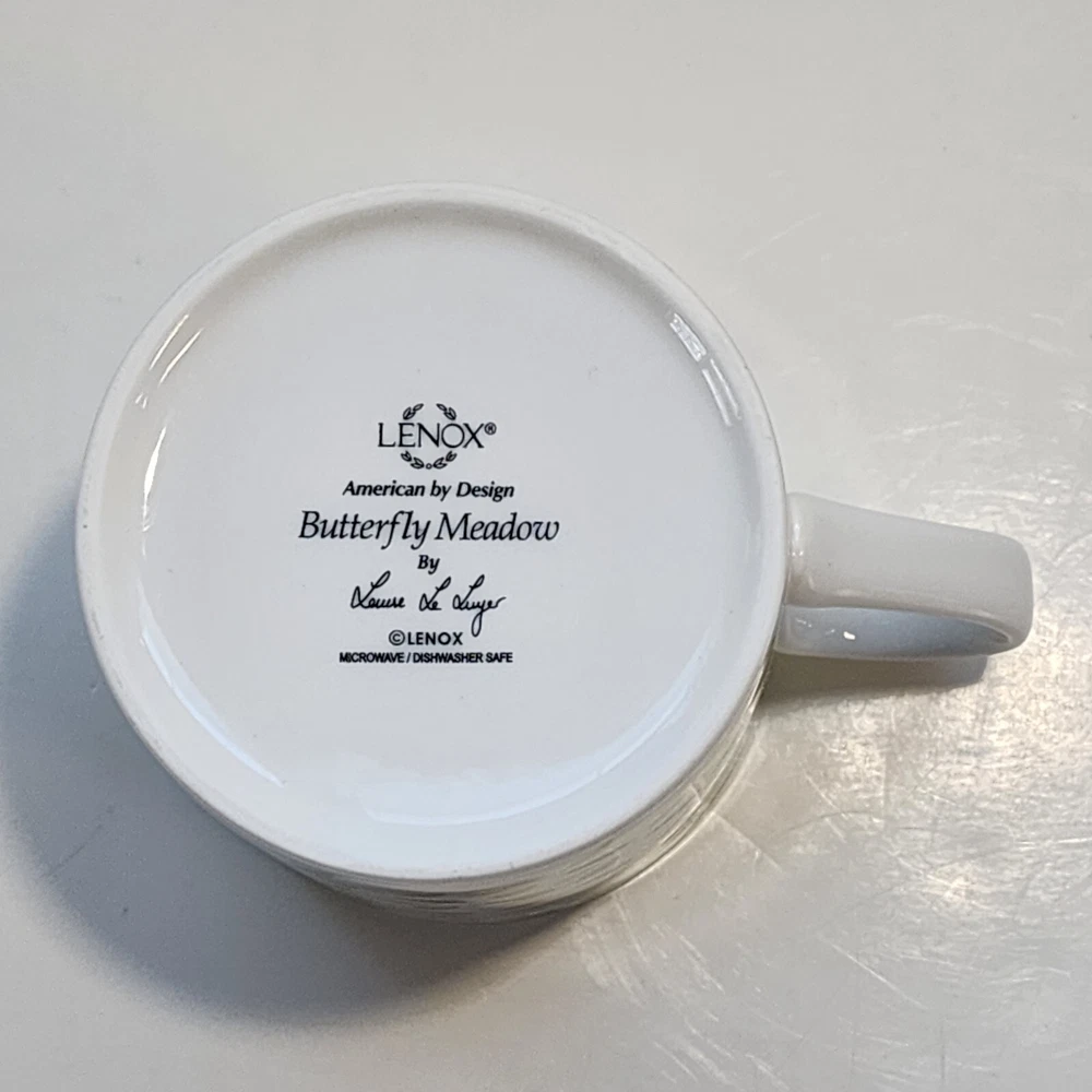 The Lenox Butterfly Meadow Sentiment Coffee Cup features a nature print of a monarch butterfly, with a round shape and a white color. Made of porcelain, this vintage coffee mug from the Lenox brand is part of the Butterfly Meadow collection. The cup is adorned with the sentiment "You are Loved" inside and is microwave and dishwasher safe, making it a charming and functional addition to your kitchen or collectibles.