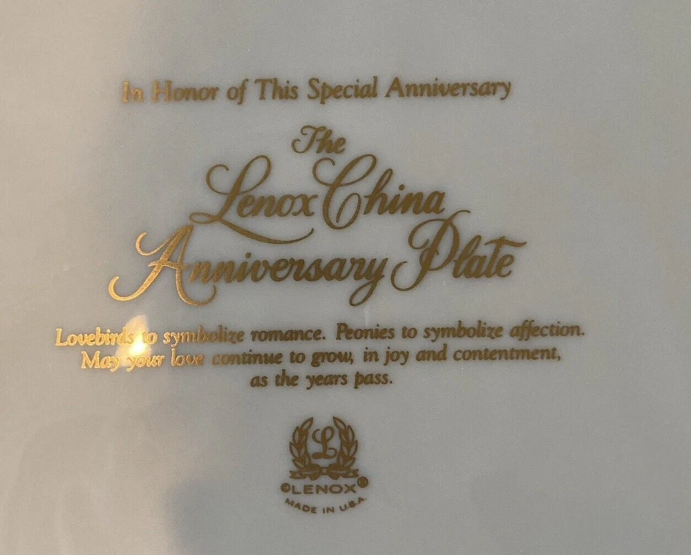 Occasion: Anniversary Pattern: Lovebirds and Peonies Item Length: 12.5 " Product Line: Special Anniversary Shape: Round Item Height: 1 inch Material: Bone China Country/Region of Manufacture: United States Handmade: No Brand: Lenox Vintage: Yes Care Instructions: Hand Wash Only Origin: America Item Weight: 2.2 lb Set Includes: Plate Only Finish: Glossy Type: Decorative Plate Features: Commemorative, Decorative, Heritage Backstamp: Printed Color: Ivory
