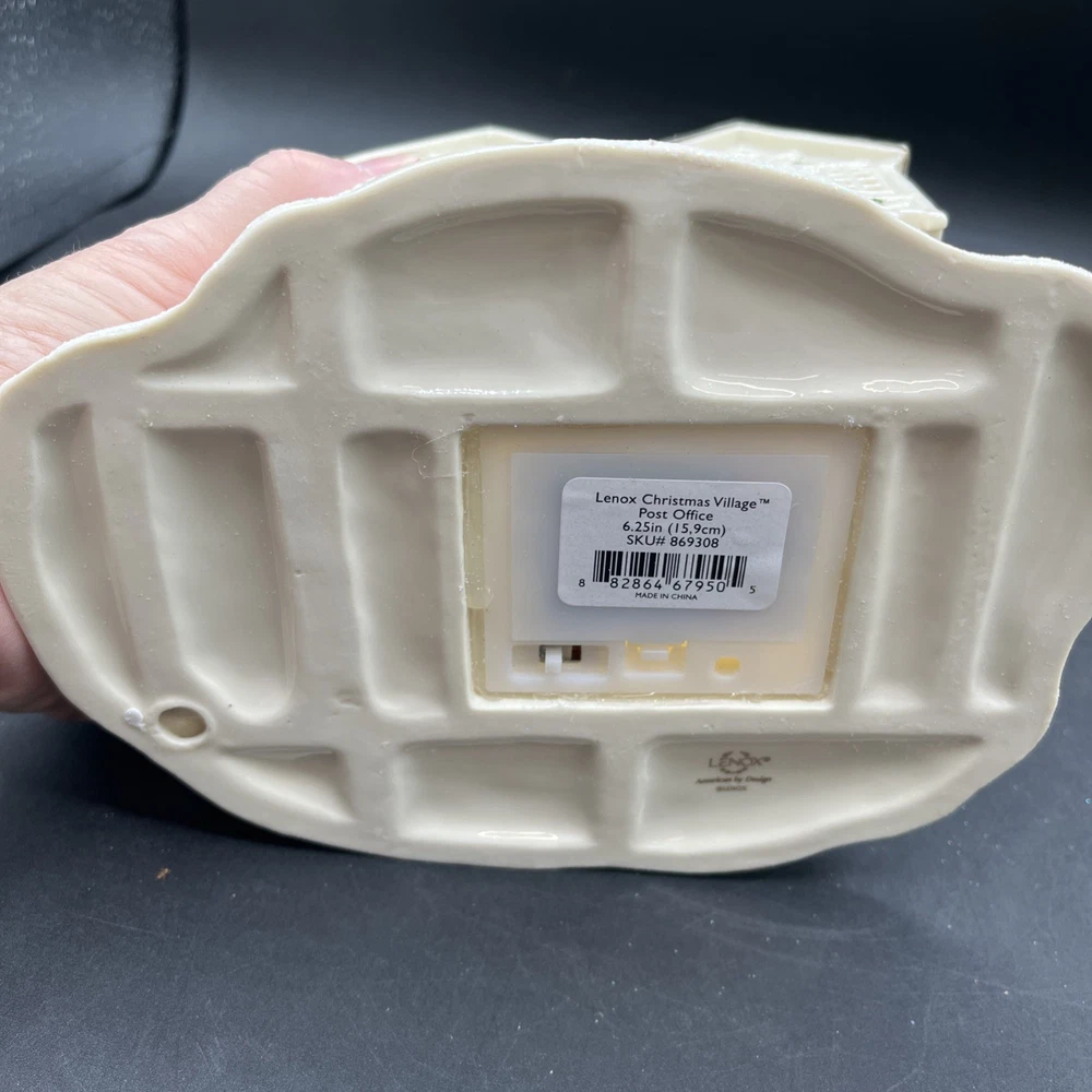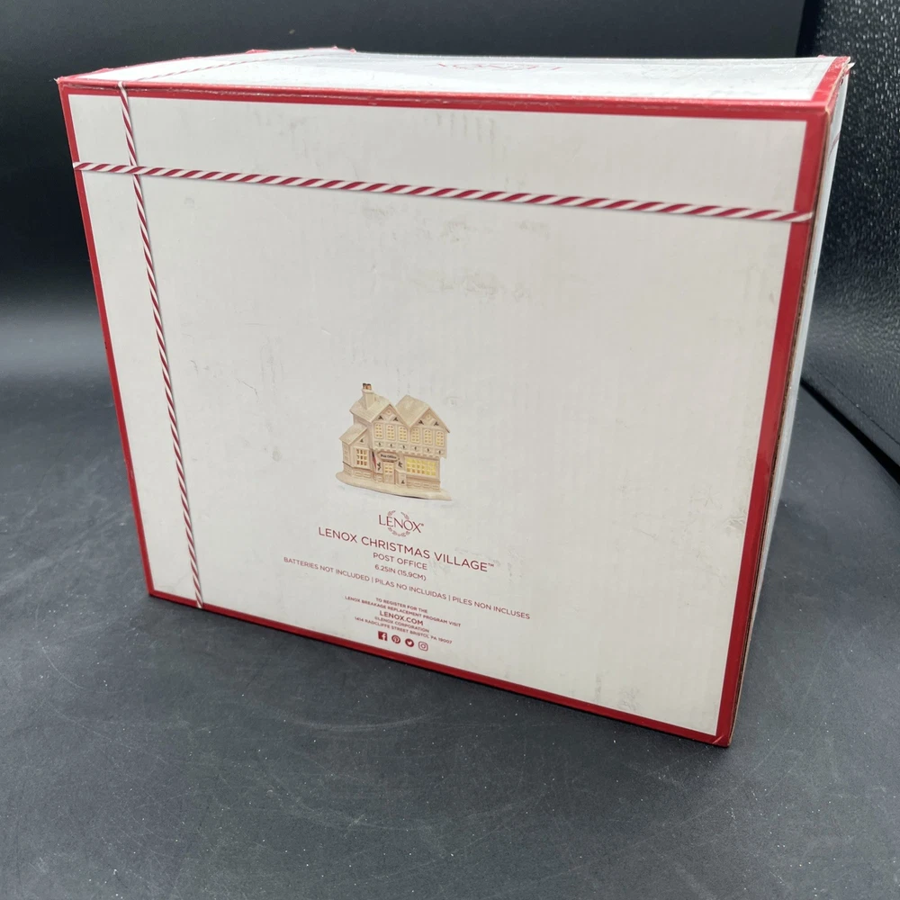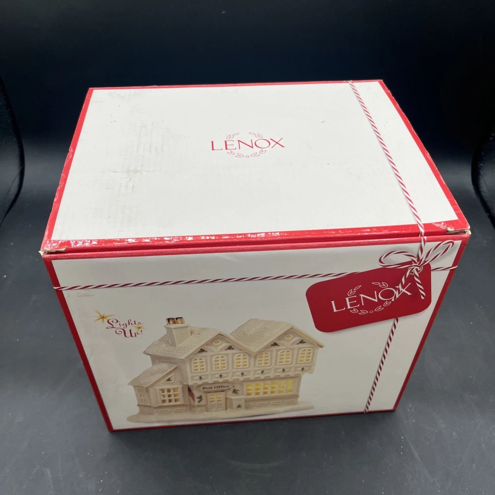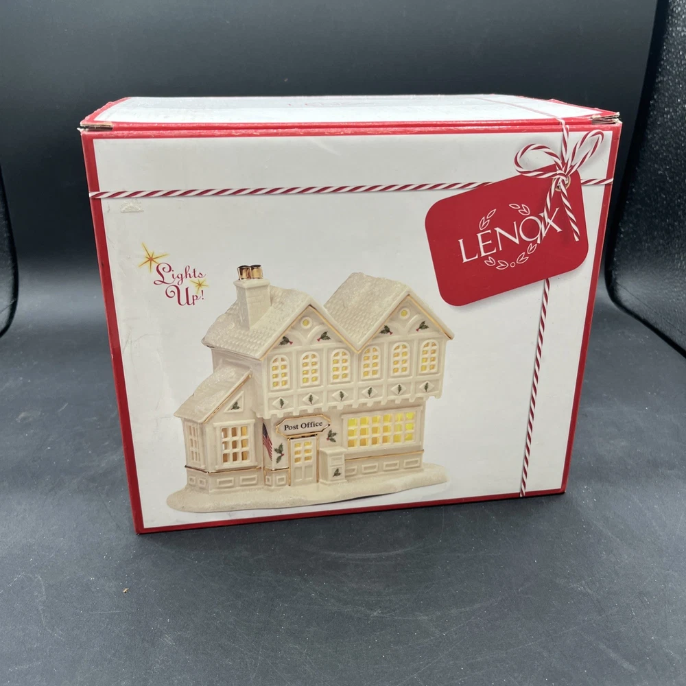 Packaging:BoxOriginal/Reproduction:Originalgtin13:does not applyItem Height:6.25 inchShape:BuildingType:Post Office BuildingOccasion:ChristmasBrand:LenoxDepartment:AdultsNumber in Pack:1Country/Region of Manufacture:ChinaSubject:Christmas Village Post OfficeAntique:NoFeatures:Boxed, Lights up with LED lightsCollection:Christmas VillageItem Length:7.25 inchRequires Batteries:3 AAA Batteries (not included)Color:MulticolorRoom:Any RoomUPC:does not applyMaterial:Porcelain