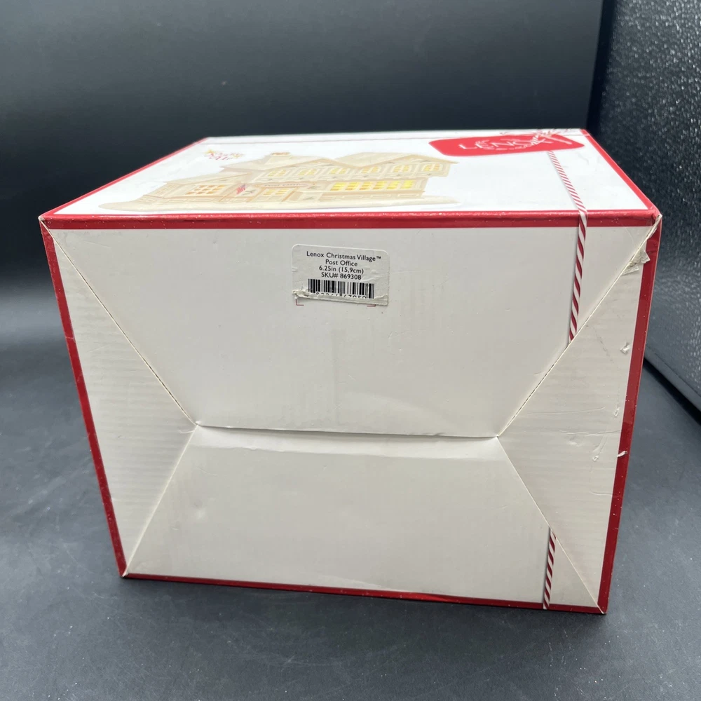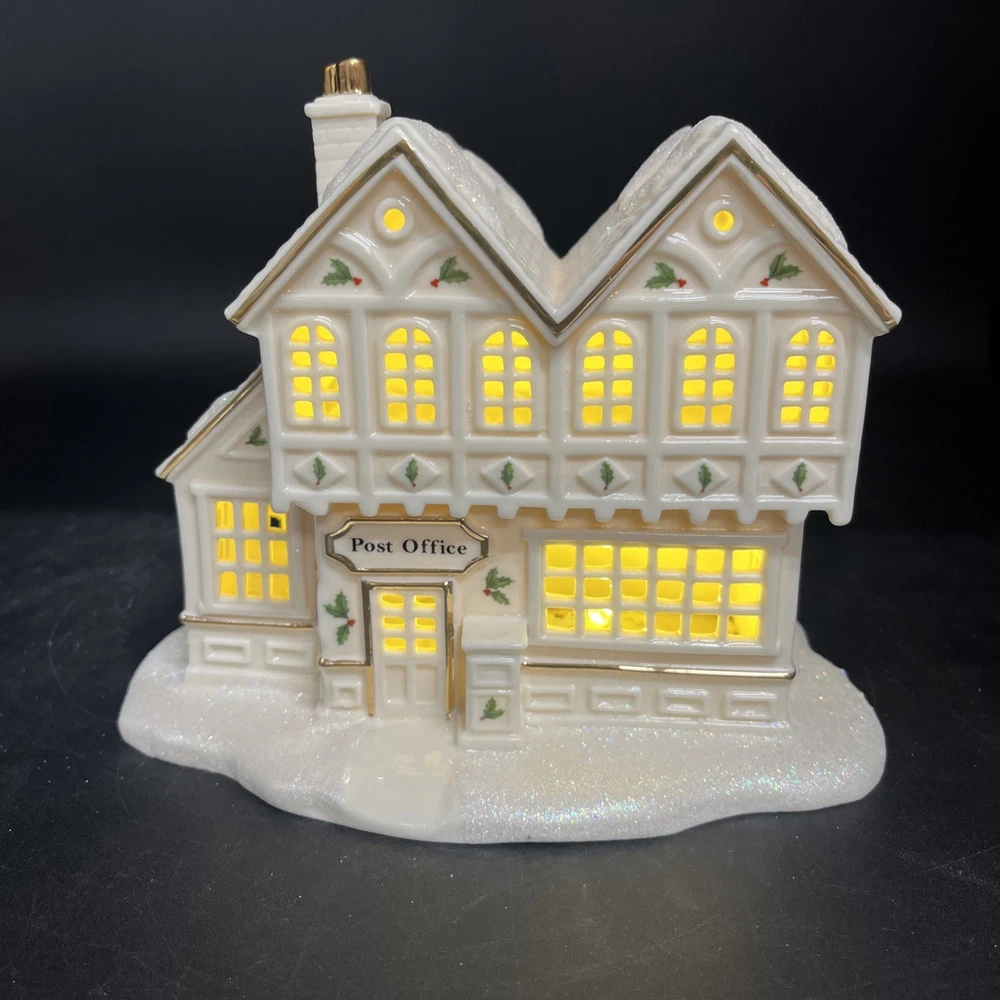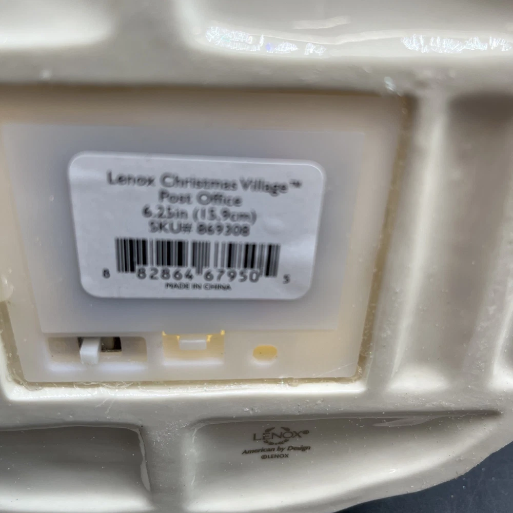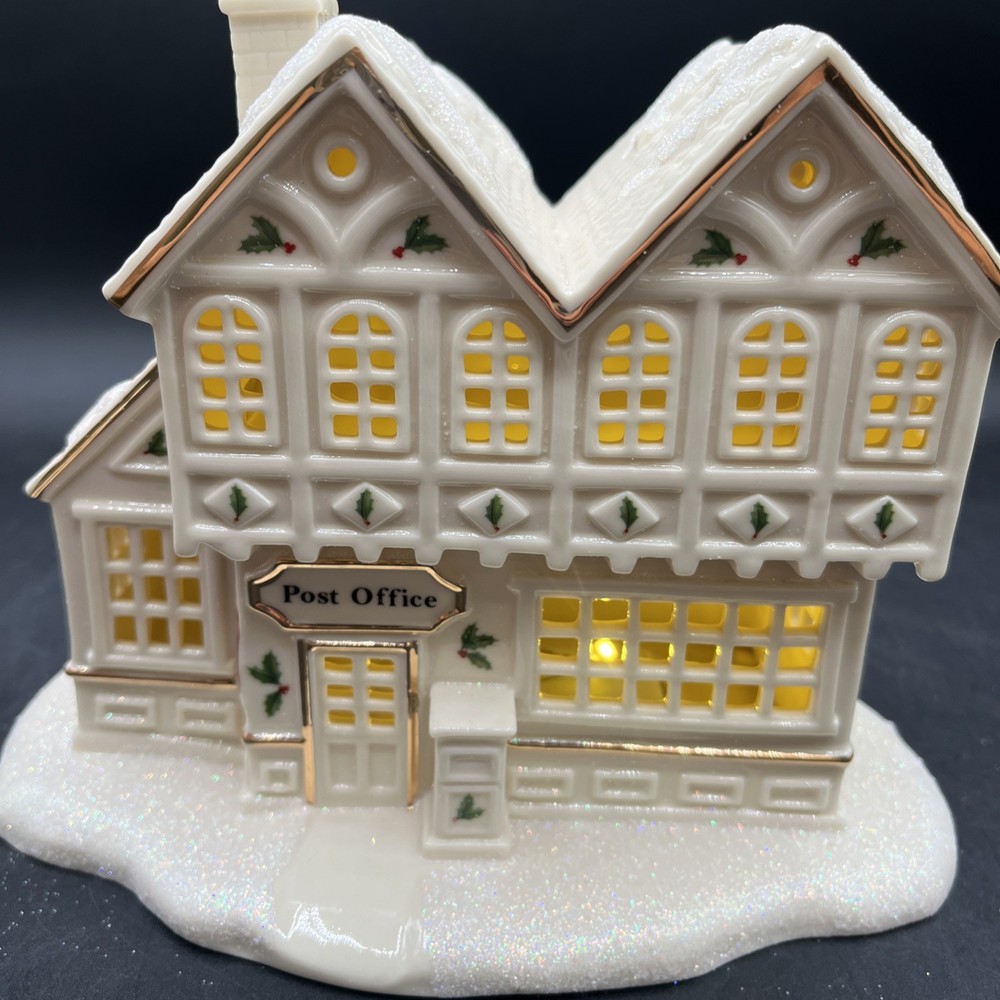 Packaging:BoxOriginal/Reproduction:Originalgtin13:does not applyItem Height:6.25 inchShape:BuildingType:Post Office BuildingOccasion:ChristmasBrand:LenoxDepartment:AdultsNumber in Pack:1Country/Region of Manufacture:ChinaSubject:Christmas Village Post OfficeAntique:NoFeatures:Boxed, Lights up with LED lightsCollection:Christmas VillageItem Length:7.25 inchRequires Batteries:3 AAA Batteries (not included)Color:MulticolorRoom:Any RoomUPC:does not applyMaterial:Porcelain