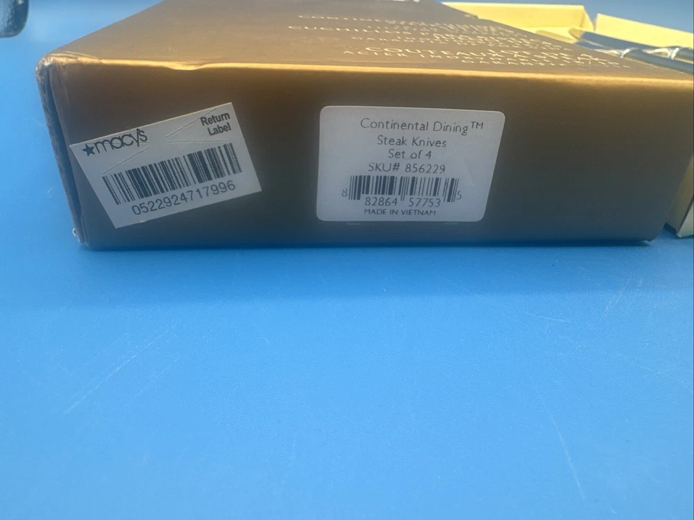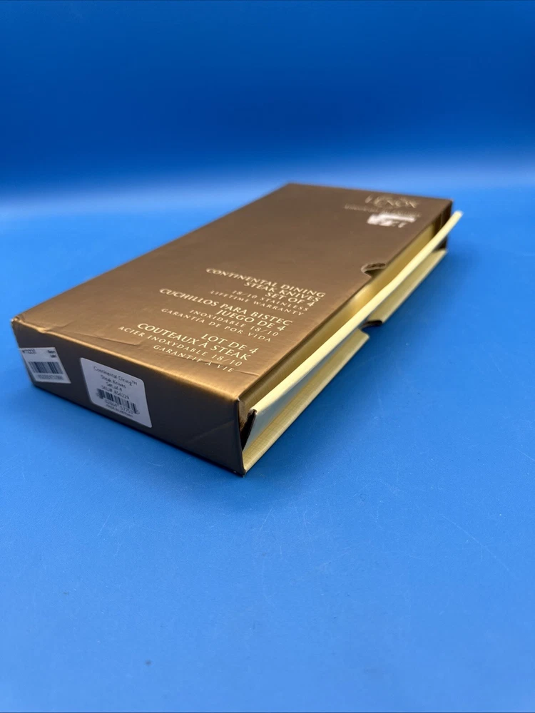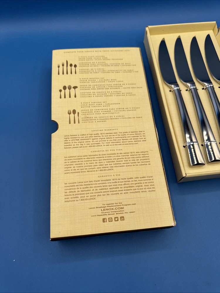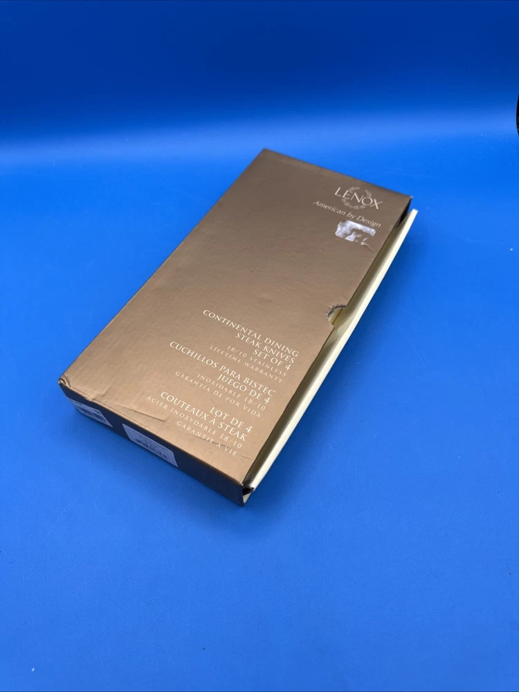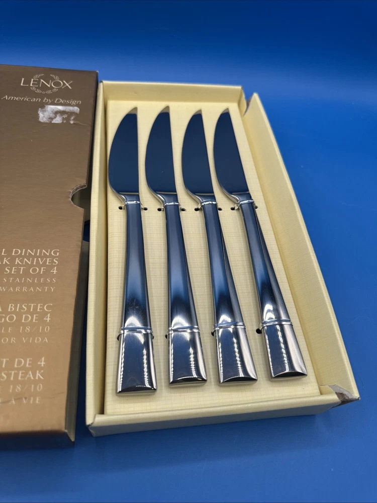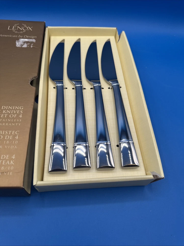 Lenox Continental Dining Steak Knives Lot of 4 #856229 includes a set of four silver steak knives made of stainless steel. The brand is Lenox, and they are designed for use in dining settings. The knives are crafted in Vietnam. Open box. Never been used. Excellent condition. Original box has some damages. Please check the pictures carefully as part of the description. Feel free to ask questions if you need more information before you buy it. Thank you for your interest B-11
