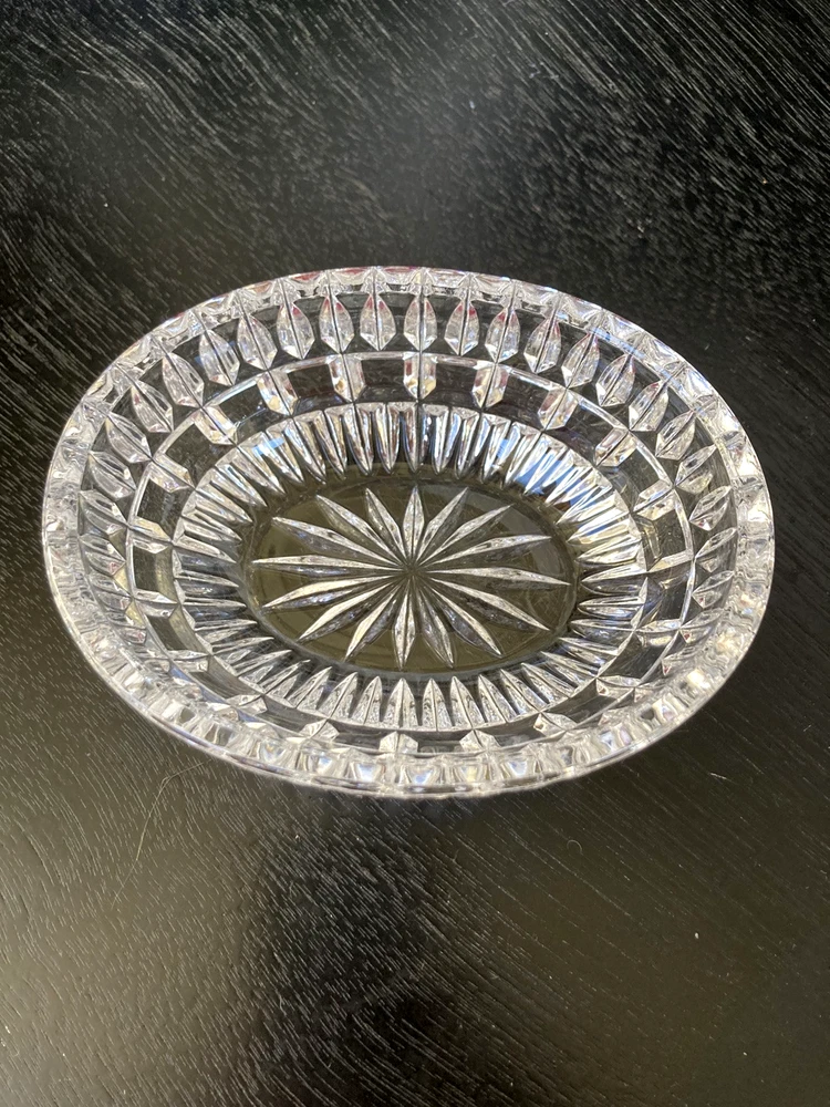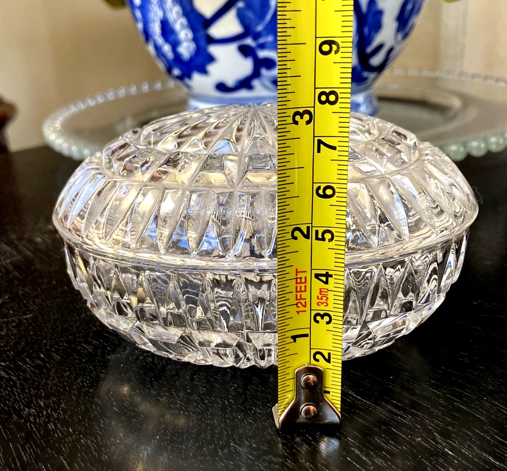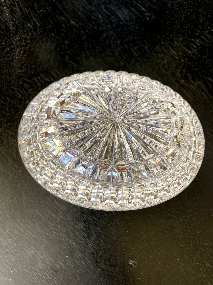 This Lenox Crystal Vintage Oval Trinket Jewelry Box from the 1980s radiates elegance and sophistication. Beautiful cut crystal piece that exudes lots of sparkle. The oval shape adds a touch of classic charm to this timeless piece, making it a perfect accessory for storing jewelry or small trinkets. The Lenox brand ensures high-quality craftsmanship and attention to detail, making this jewelry/trinket box a beautiful and functional addition to any collection or decor. Perfect accessory for a vanity table, bedside table or bathroom counter. A lovely way to keep your jewelry contained until ready to wear again.