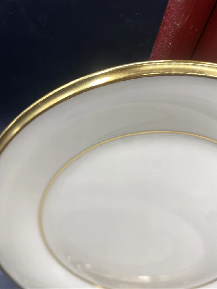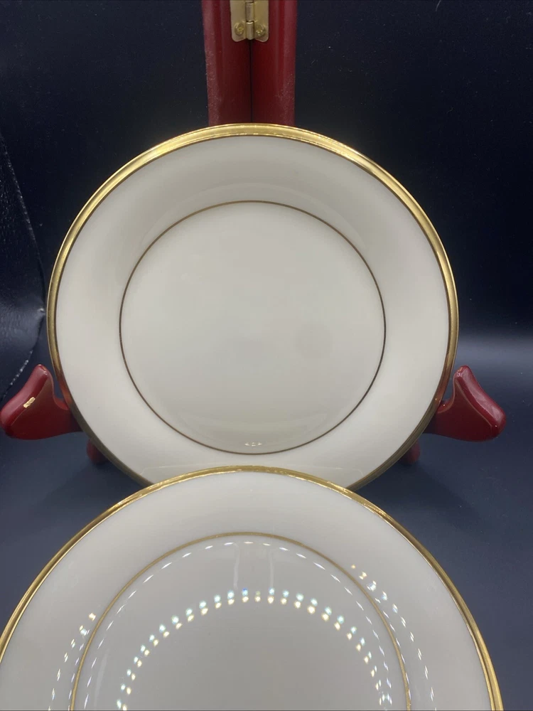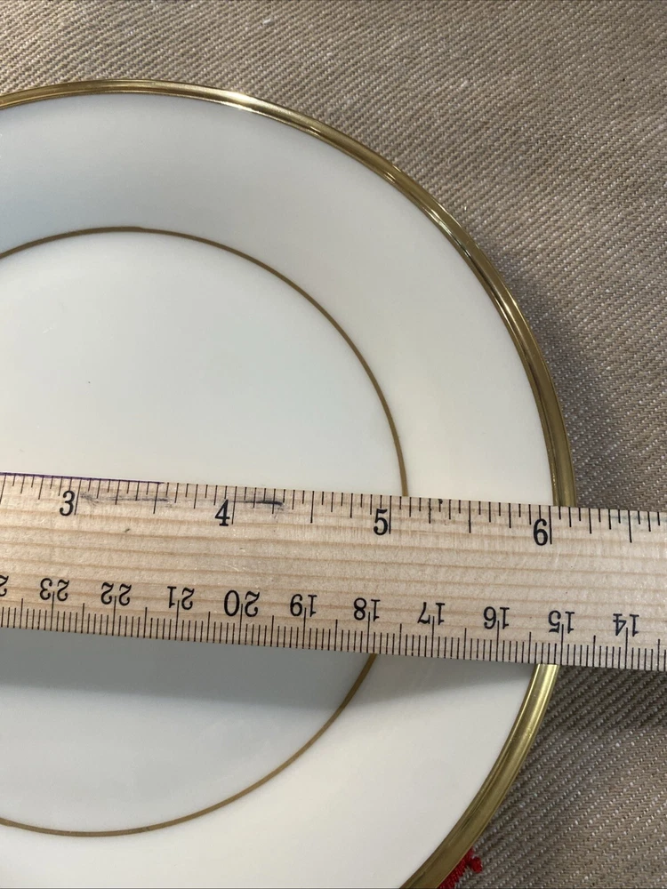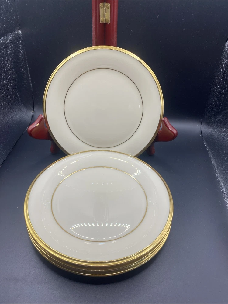 Enhance your dining experience with this exquisite set of four Lenox Eternal bread plates from the Dimension Collection. Each plate measures 6 1/4 inches in diameter and features a classic ivory color with a stunning gold trim. Made from high-quality bone china, these plates are perfect for all occasions, whether a casual breakfast or a formal dinner party. With a vintage look and feel, these plates have a glossy finish and are produced using traditional pottery techniques. The backstamp is printed and the production style is art pottery. The set includes bread plates and is an original product from the United States. Add a touch of elegance to your table setting with this timeless collection from Lenox.