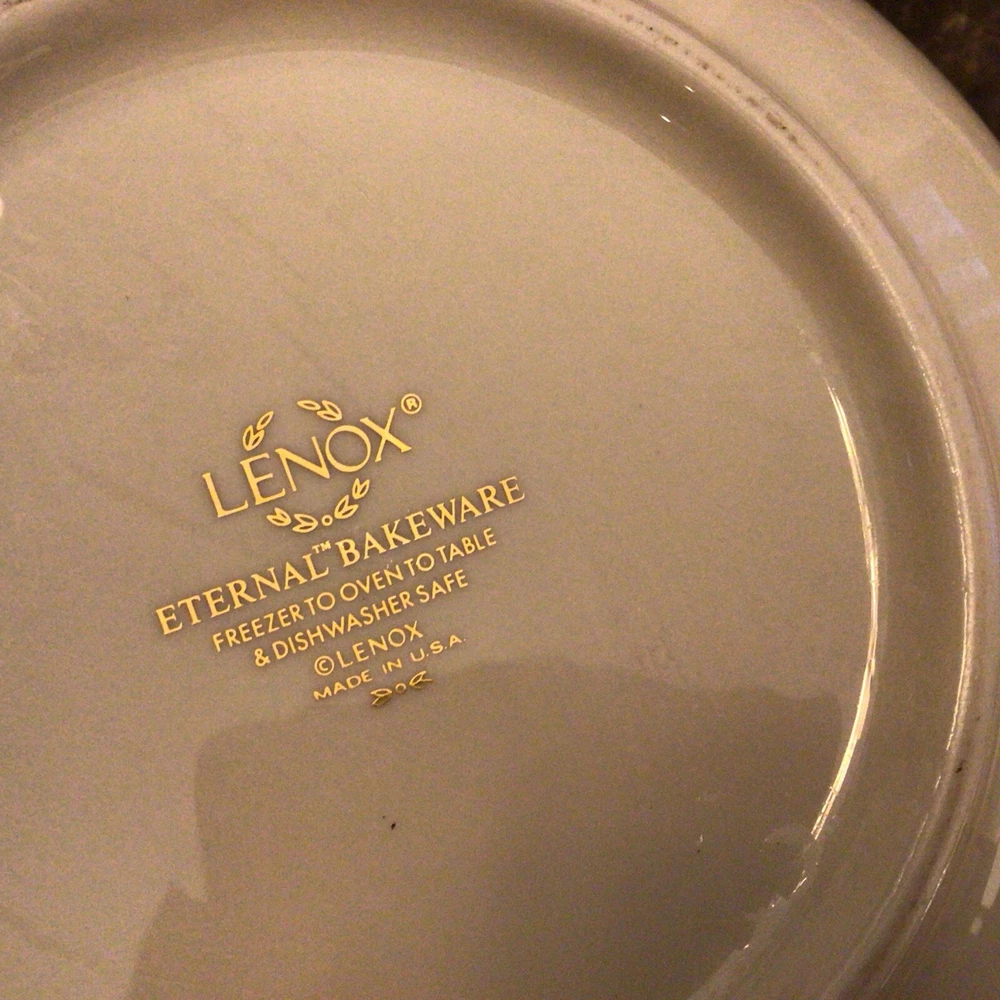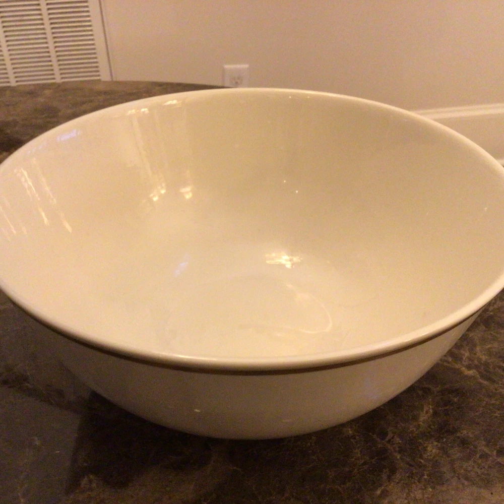 The Lenox Eternal China Dimension Serving Bowl is a round, 10.5" large bowl made of porcelain with a beige color and gold trim. It is dishwasher safe and features an elegant design perfect for serving a variety of dishes. The bowl is part of the Eternal product line by Lenox and is made in the United States. With a printed backstamp, this serving bowl is a stylish and practical addition to any table setting. No issues excellent condition