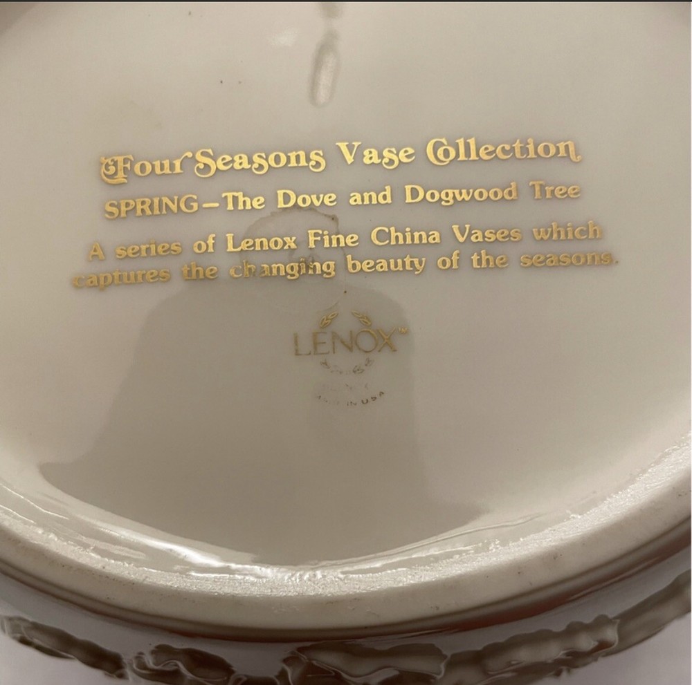 Lenox Four Seasons Vase Collection - Spring - The Dove and Dogwood Tree. Lenox Four Seasons Collection “The Dove & Dogwood Tree” Description: Embossed, Birds, Floral, Gold Trim Pattern: Four Seasons Vase Collection by Lenox Status: Discontinued 1988-VINTAGE