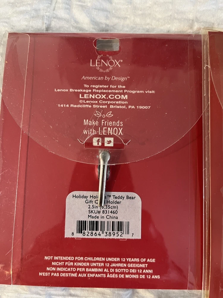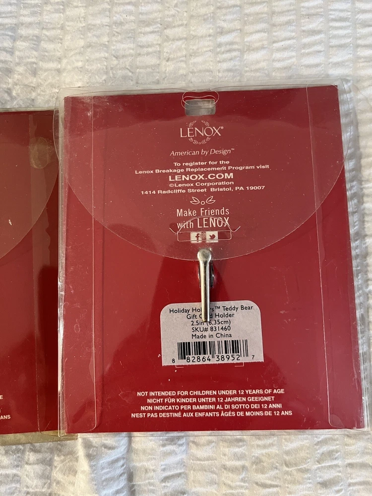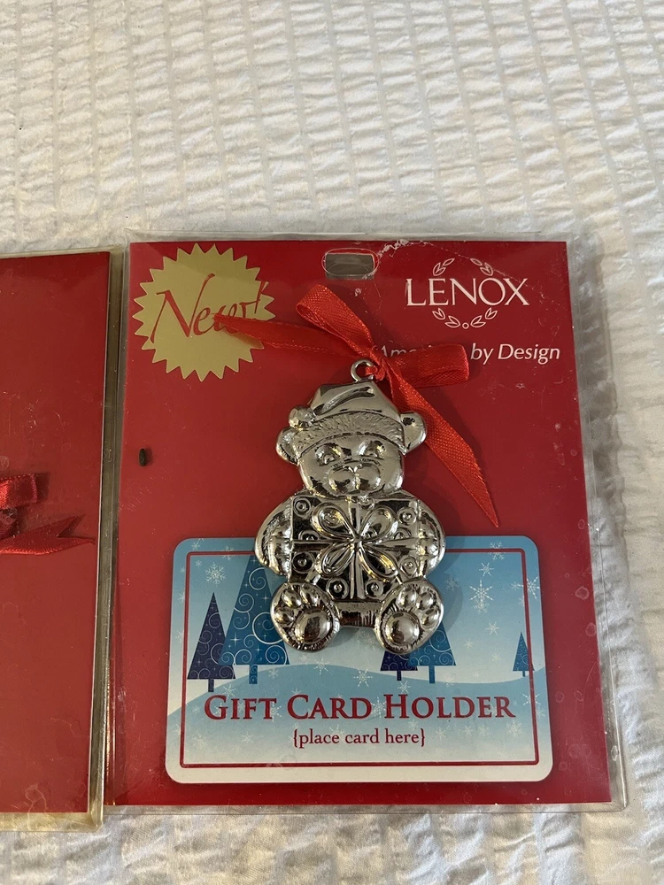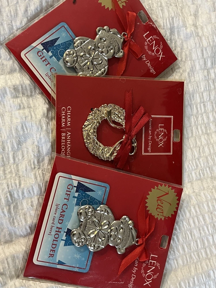 Lenox Gift Card Holders. Set of 2 bears and 1 Lenox charm wreath. The bears are silver and the wreath charm is gold. New, never used. Measure appropriately 2” tall.
