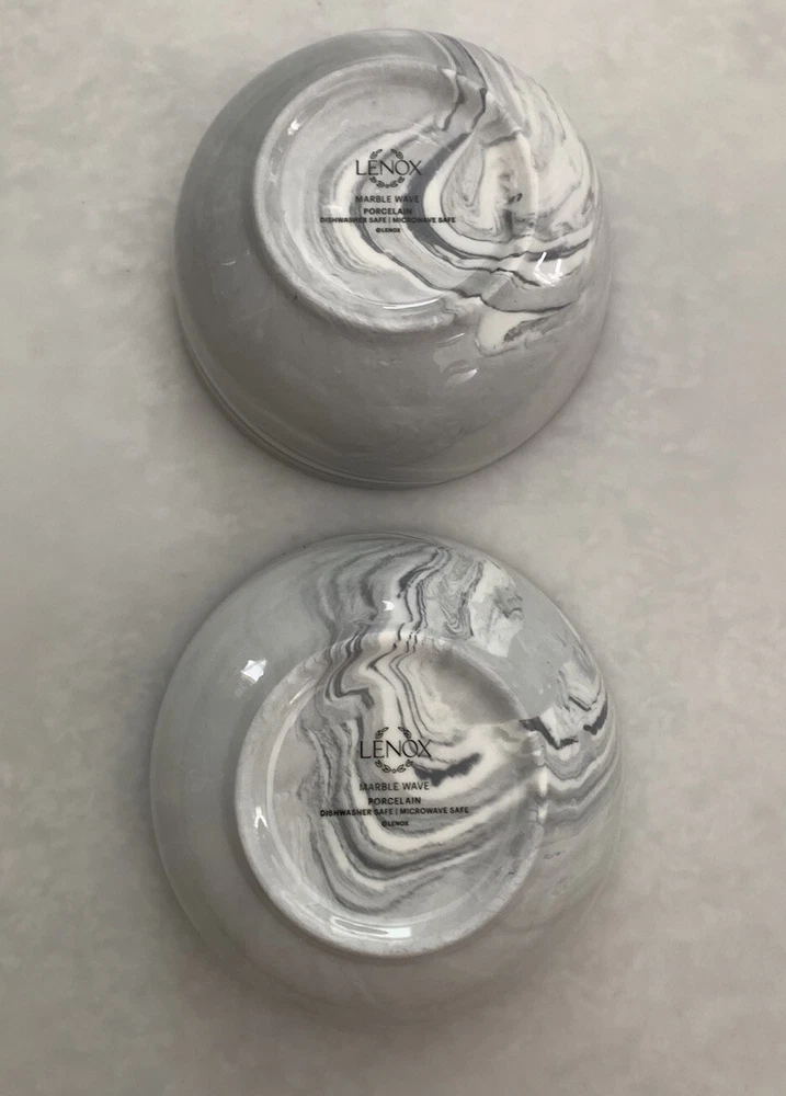 Very good condition. This set of 2 Lenox Gray Marble Wave Porcelain Bowls features a stylish Marble Swirl pattern, making them a chic addition to any dining table. The bowls are round in shape and have a diameter of 5 1/4 inches, perfect for serving soups, salads, or snacks. They are made of high-quality porcelain, ensuring durability and a microwave and dishwasher-safe design for convenient use. Perfect for everyday meals or special occasions, these Lenox bowls combine elegance with functionality for a versatile addition to your dinnerware collection.