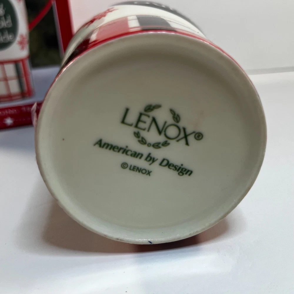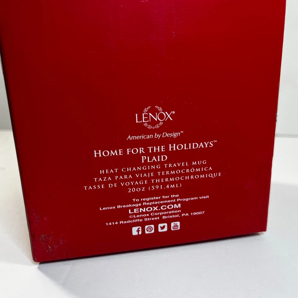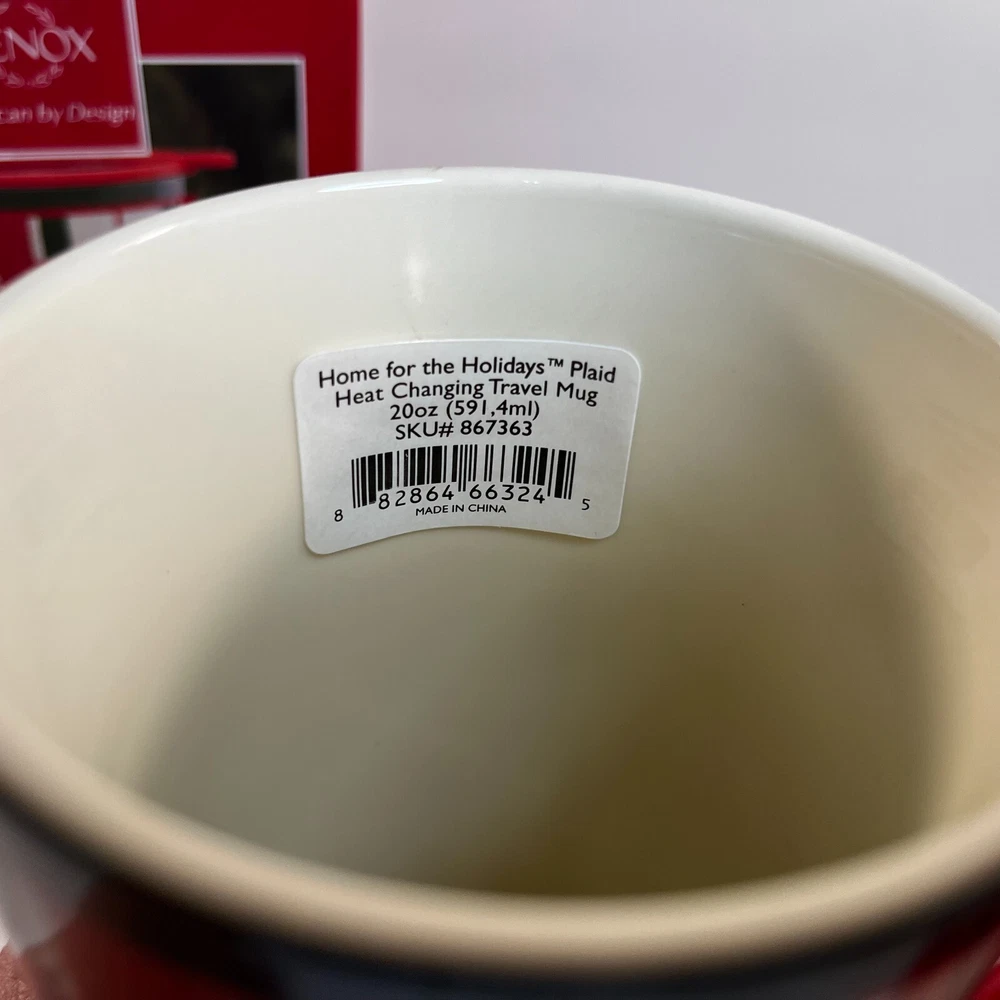 Lenox Heat Changing Travel Mug "Baby It's Cold Outside" Home for the Holiday Plaid Holds 20 oz 867363 Made of ceramic with a plastic lid Comes new with tags The Black changes to Blue when Heated