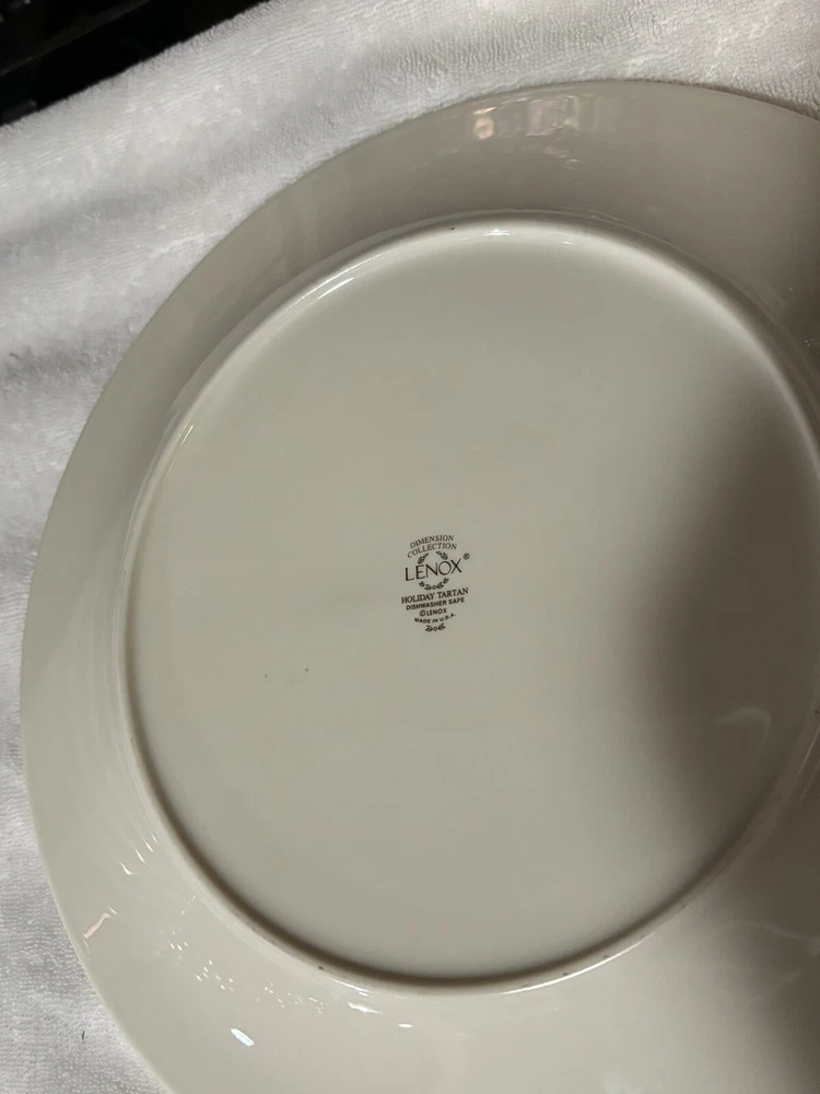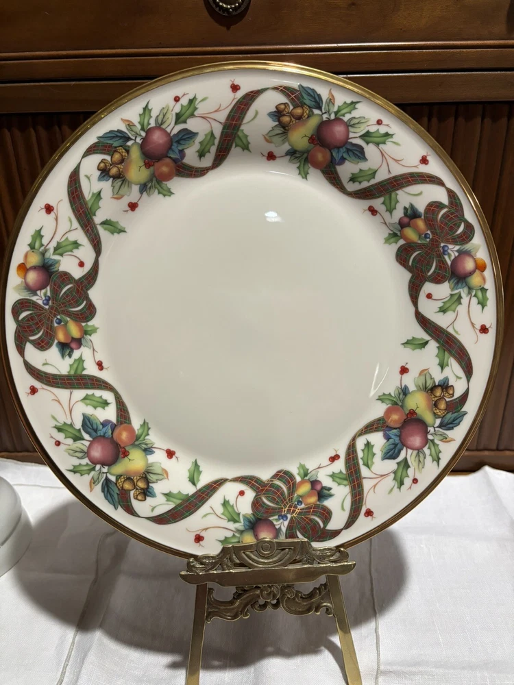 Dinner Plates are 10 3/4" Dia. Replacements and other Ebay sellers list these as high as $80/plate. This is a retired pattern but still widely available online. The pattern has a rich border of fruit, nuts, holly and a tartan ribbon accented with a 24K gold rim. It is perfect for any fall dinner but especially Thanksgiving and Christmas. It still shines like new with no scratches or chips. See my other listings for additional pieces to this pattern. As noted in condition, they are pre-owned but do not look as if they have been used at all. Please ask for more photos if you want them. Holidays COULD POSSIBLY impact shipping/handling time; just connect with me if you are in a hurry and I will do what I can to expedite. :)