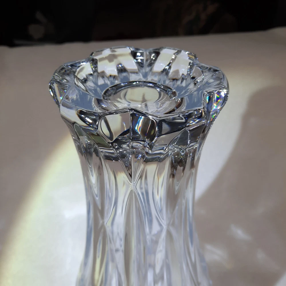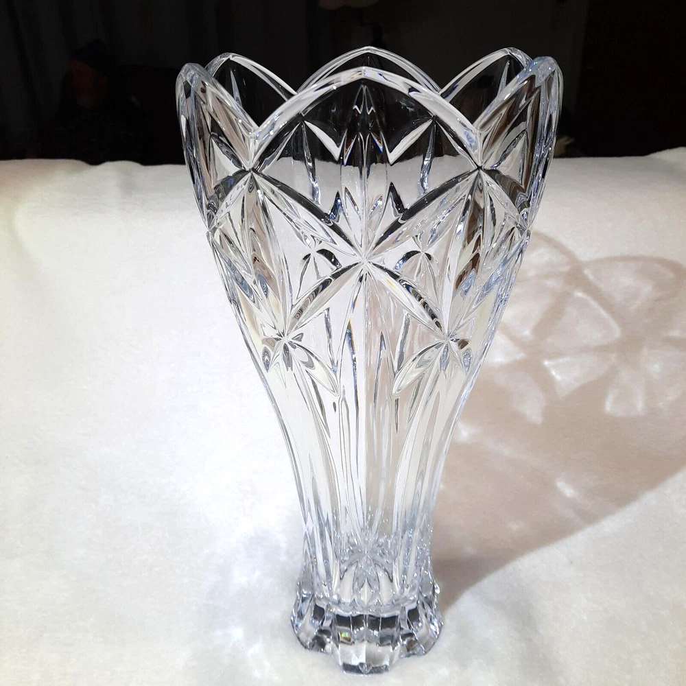 The Lenox Heavy Crystal Vase is a stunning 14" tall vase featuring a Shooting Stars pattern. Made of full lead crystal, this contemporary vase is elegantly designed with a glossy finish, perfect for all occasions, including weddings and everyday celebrations. With a clear color and a weight of 7 lb 9oz, this original Lenox vase showcases a beautiful flower design and is ideal for displaying fresh or artificial flowers in an adult's living space. It is recommended to clean this vase with warm water to maintain its pristine appearance.