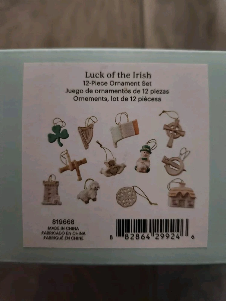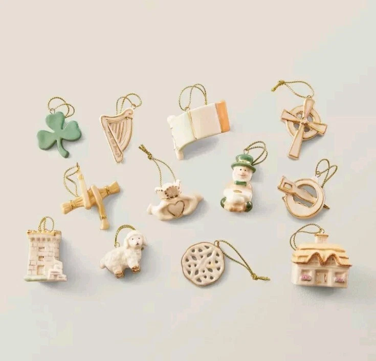 DESCRIPTION Celebrate St. Patrick's Day with the Irish 12-piece Ornament Set, crafted of hand-painted ivory china. The ornaments include a shamrock, cross, leprechaun and more. DETAILS Item #819668 Ivory fine china accented with 24 karat gold Twelve Ornaments Gold cords for hanging