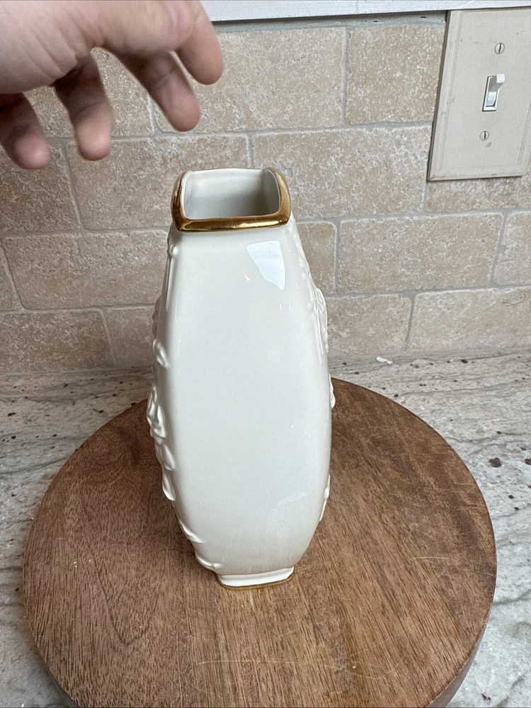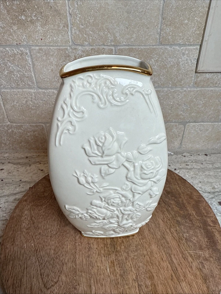 This exquisite Lenox Masterpiece vase is a true masterpiece with its beautiful floral pattern and elegant 24K gold trim. The ivory porcelain vase measures 8 1/4" in height and features a medium size that makes it perfect for displaying flowers or other decorative items. The embossed finish adds a touch of sophistication to the vase, making it a great addition to any collection. Made in China, this table vase is a perfect example of Lenox's craftsmanship and attention to detail. The brand is known for producing high-quality porcelain items, and this vase is no exception. Its classic design and timeless appeal make it a great gift for any occasion or a lovely addition to your own home decor.