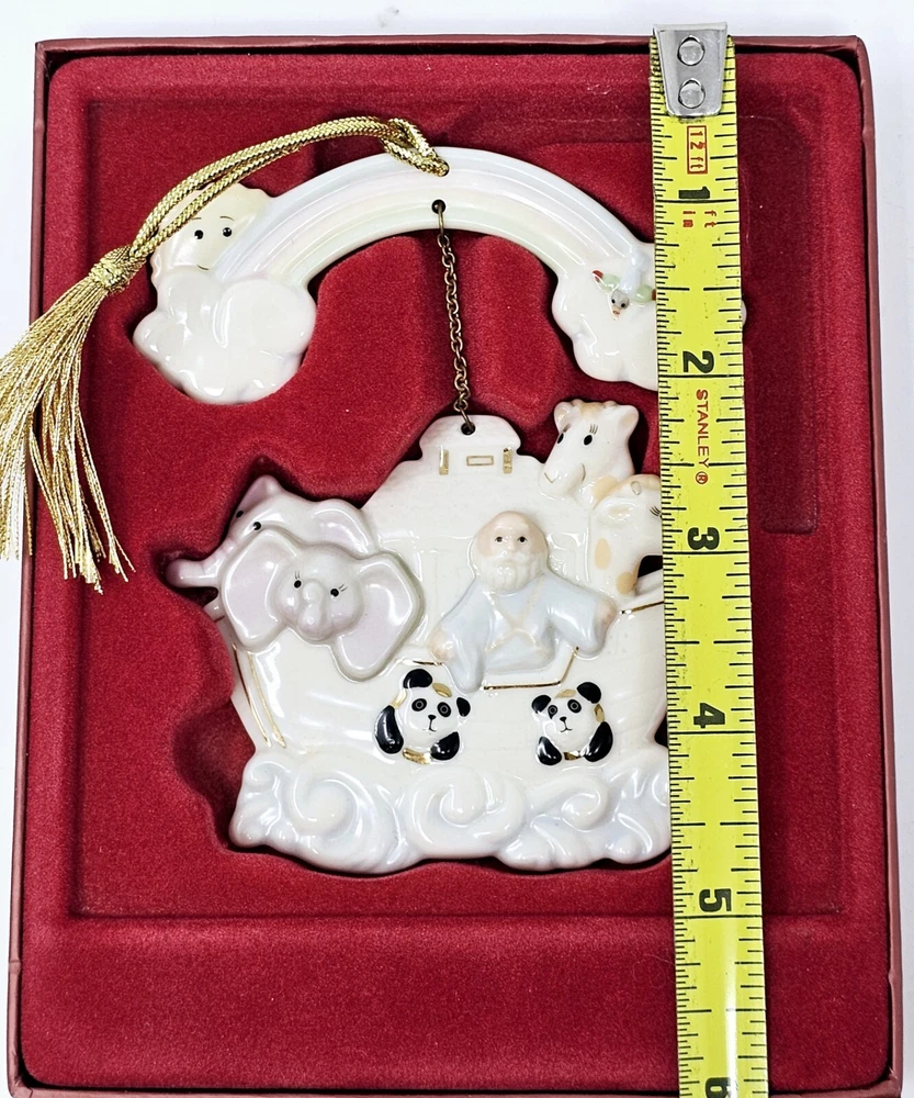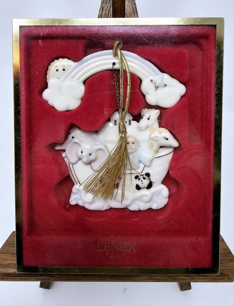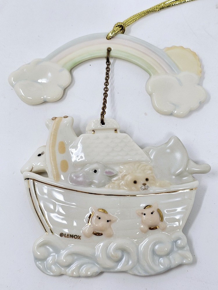 Lenox Noah's Ark with Rainbow Porcelain Ornament #6119044 with Box Christmas Nice clean ornaments. Box in good shape. This exquisite Lenox porcelain ornament is a must-have for collectors and enthusiasts out there. Celebrate the holiday season in style with this medium-sized ornament that showcases a boat and rainbow design, depicting Noah's Ark. This vintage item was manufactured in 1999 and comes with its original box. Featuring a hanging feature, this Lenox Noah's Ark ornament is perfect for your Christmas tree or as a decorative element in your home. The ornament measures 3.75 inches in width and is in excellent condition. Add this to your collection today and make your holiday season more colorful with this beautiful Rainbow Porcelain Ornament.