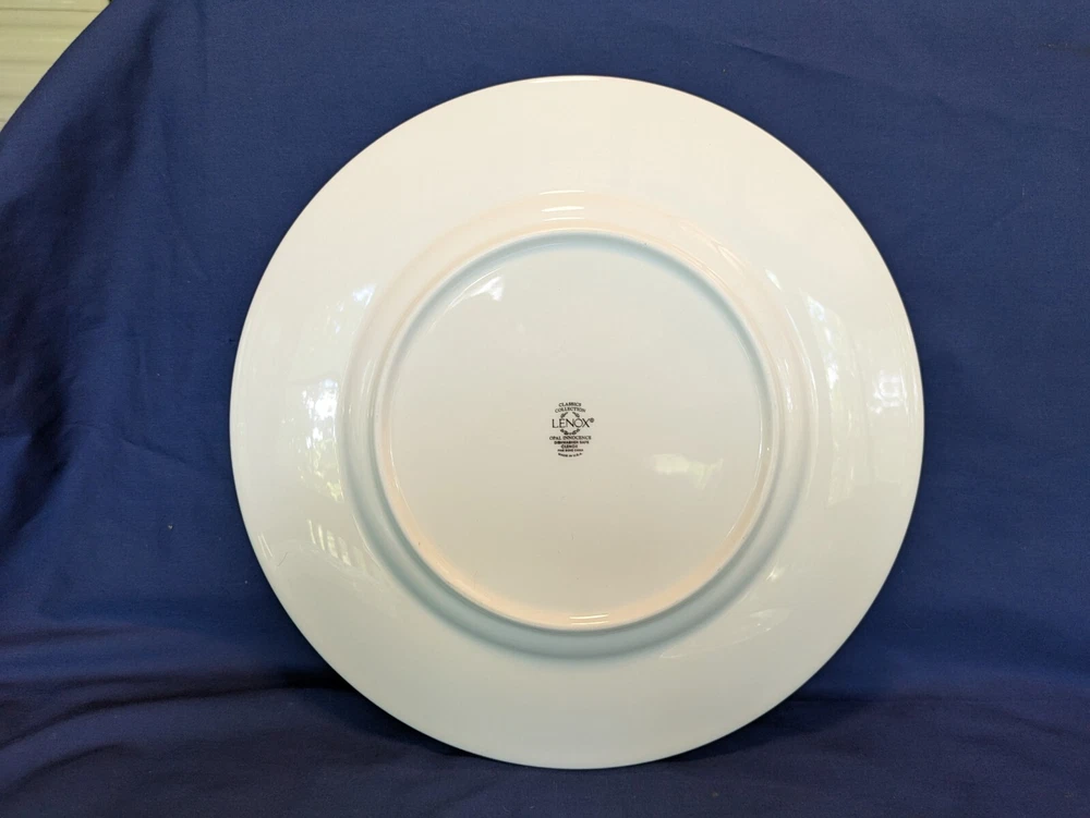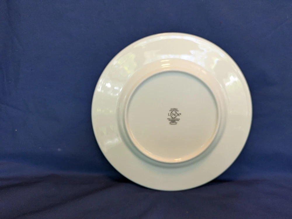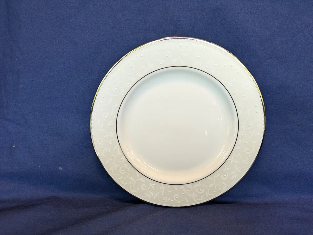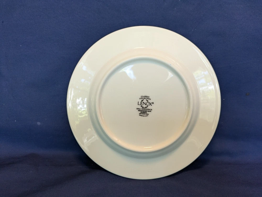 Lenox Opal Innocence 3 Piece Place Setting Dinner- Salad- Bread Plate. The dinner plate has a couple of light scratches. The dinner plate is about 10 7/8", the salad plate is about 8 1/8", and the bread plate is about 6 1/2". Thanks for looking!!