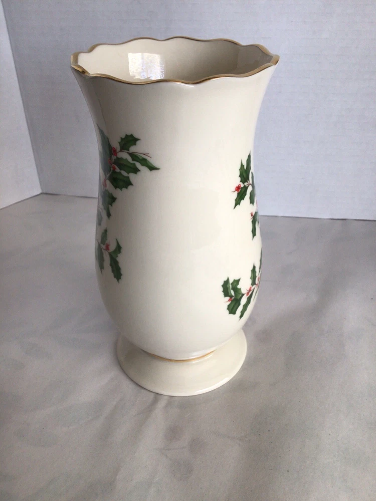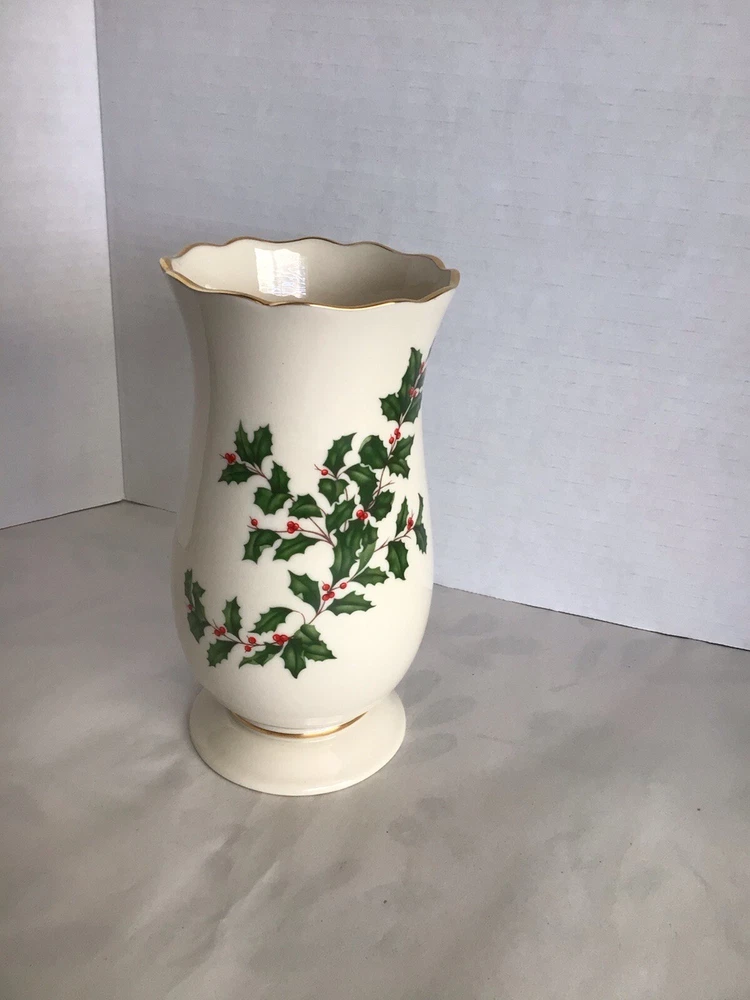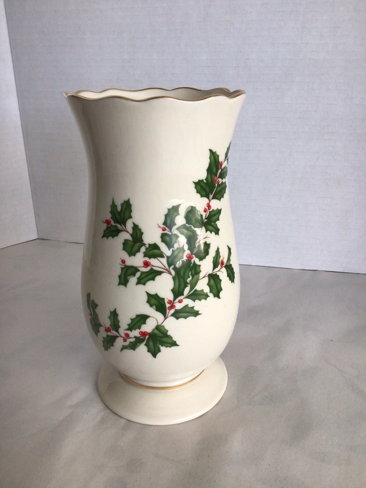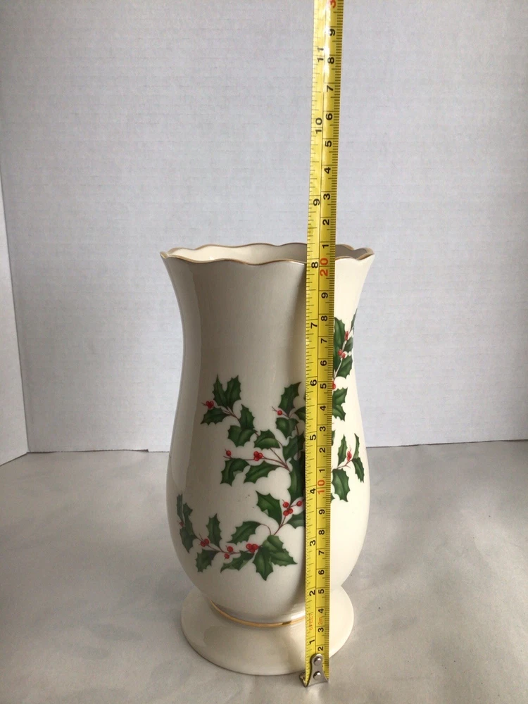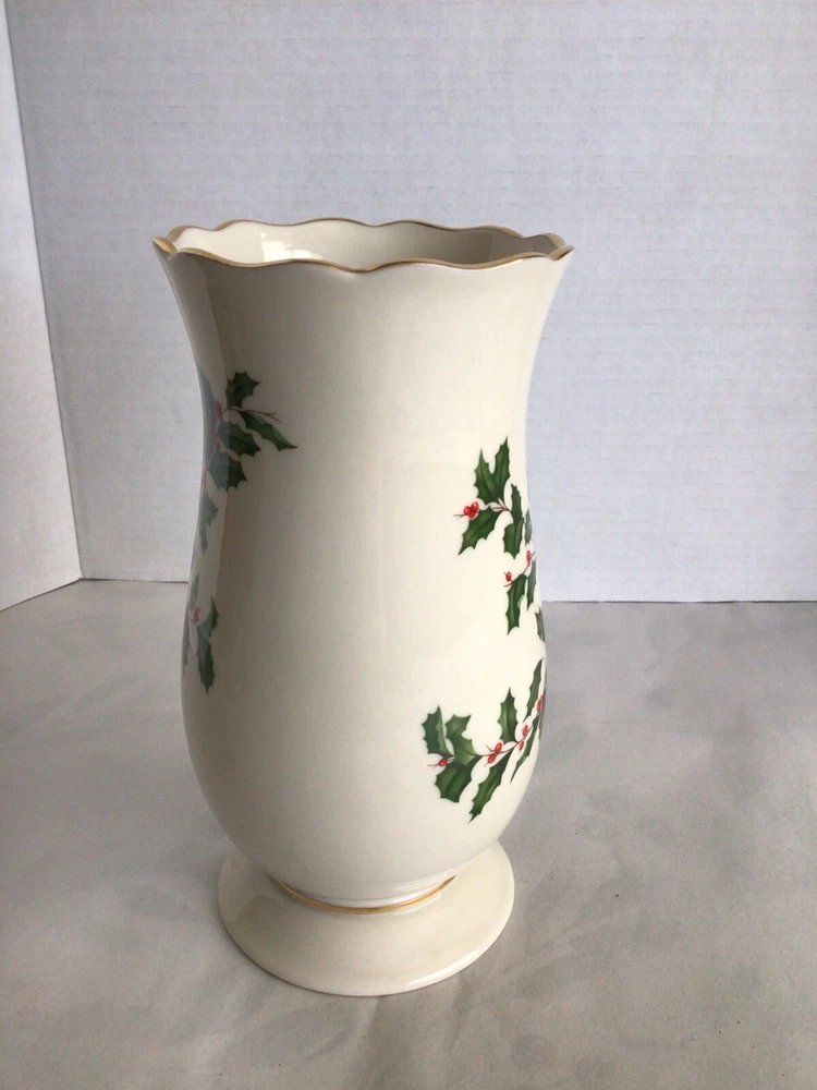 This Lenox porcelain vase is perfect for adding a touch of elegance to your holiday decor. The vase features a beautiful holly pattern with gold trim and a scalloped edge. Measuring 8 inches in height and 5 inches in width, this ivory vase is perfect for holding your favorite flowers or as a decorative piece on its own. Made in the United States with high-quality porcelain and a glazed finish, this vase is sure to last for years to come.