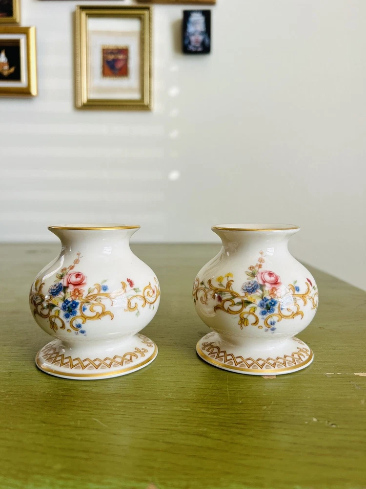 The Lenox Queen's Garden Candlestick Holders are a pair of decorative collectibles made in the USA. Featuring a 24K golden trim, these candle holders add a touch of elegance to any space. The intricate design and high-quality craftsmanship make them a luxurious addition to any home decor. Perfect for creating a warm and inviting ambiance, these Lenox candlestick holders are a timeless and sophisticated choice for any collector or home decorator. (Joe)