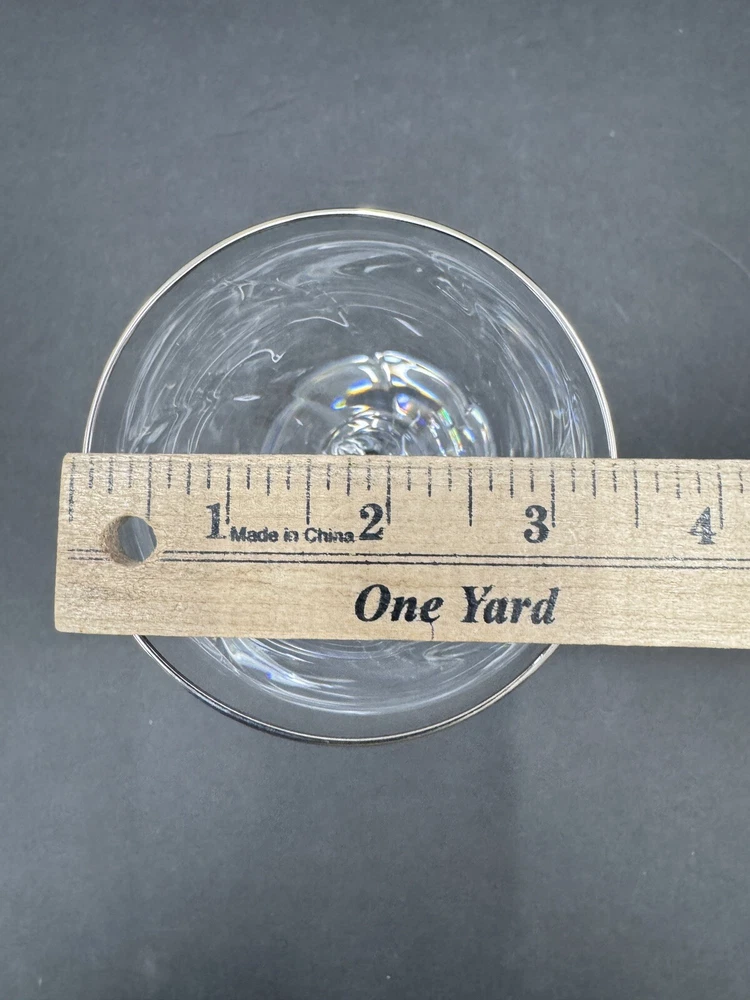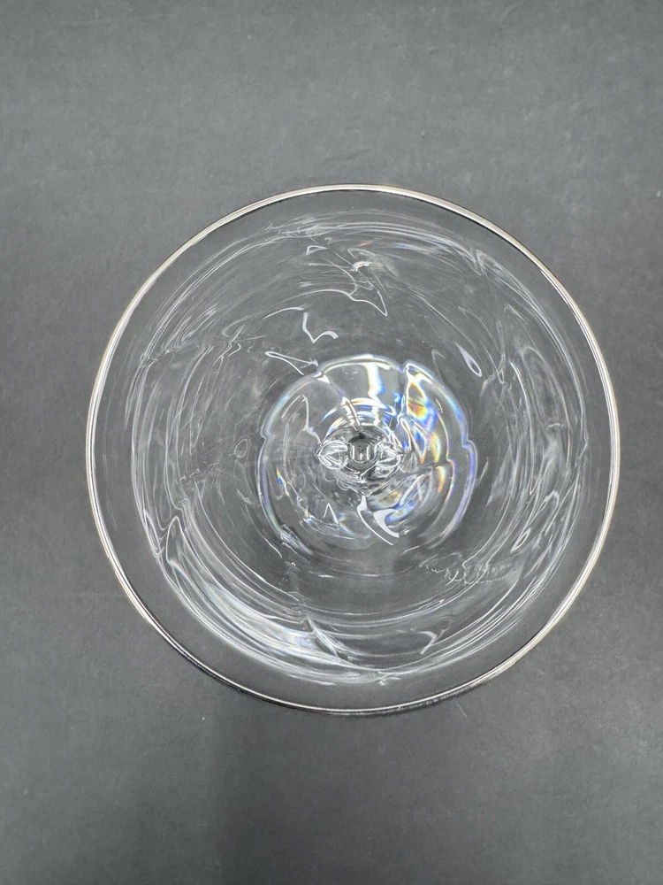 The Lenox Rhythm Platinum Water Goblet Glass is a vintage hand-blown piece from 1991, made in the USA. This elegant goblet features a contemporary style with a round shape and a twist stem etched with platinum trim. It has a 12 oz capacity and stands at 8.5" tall, making it suitable for various occasions. The swirl optic pattern adds a touch of sophistication to the glossy finish, making it a stylish addition to any drinkware collection.