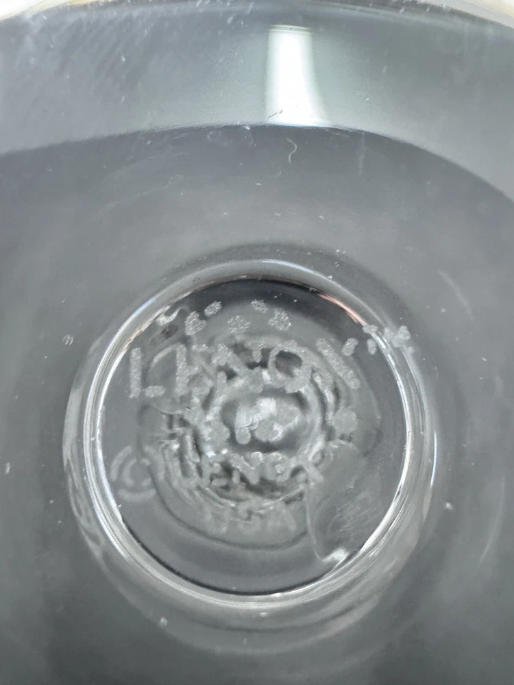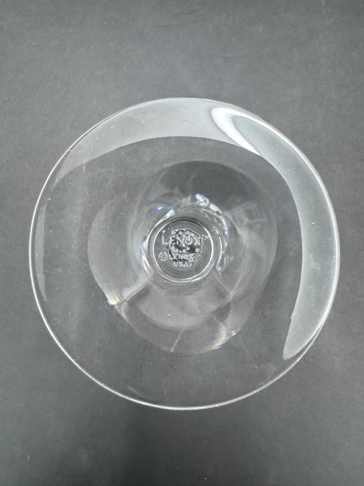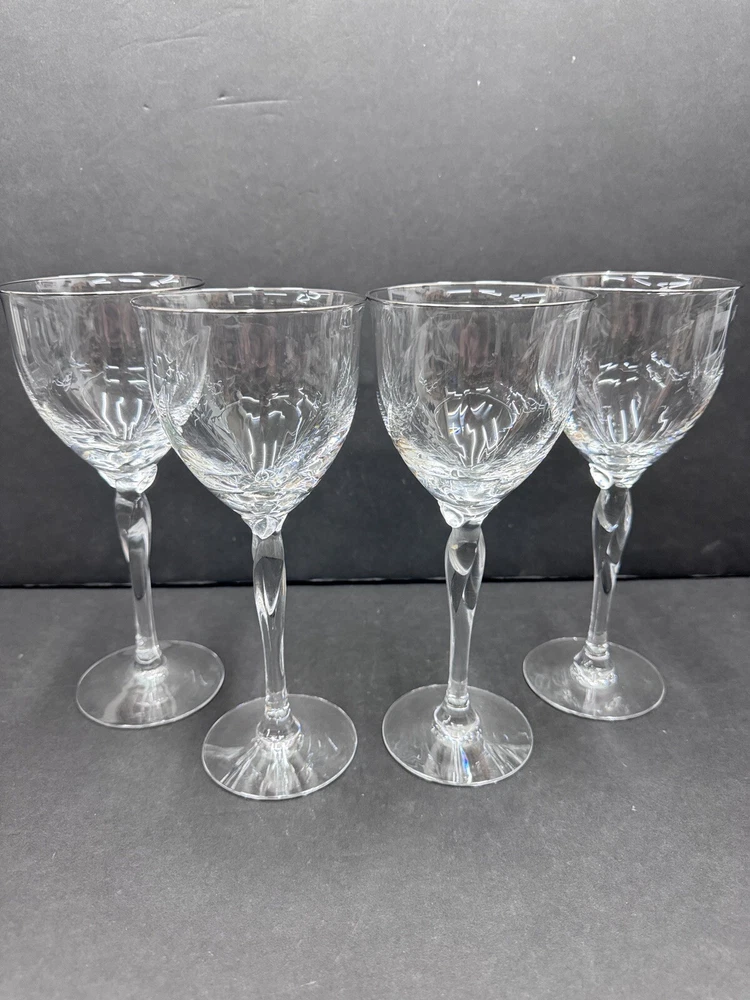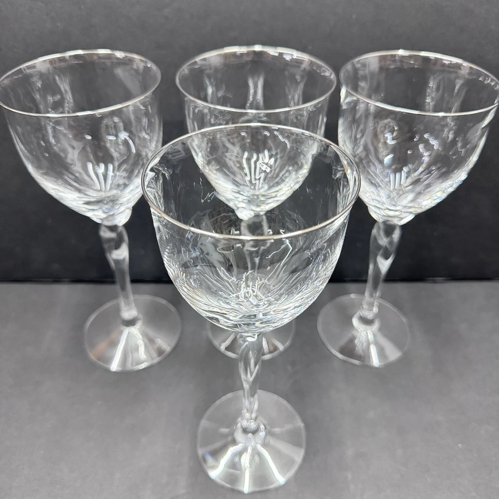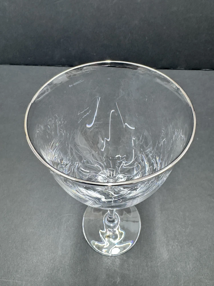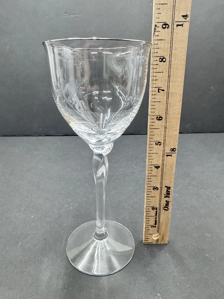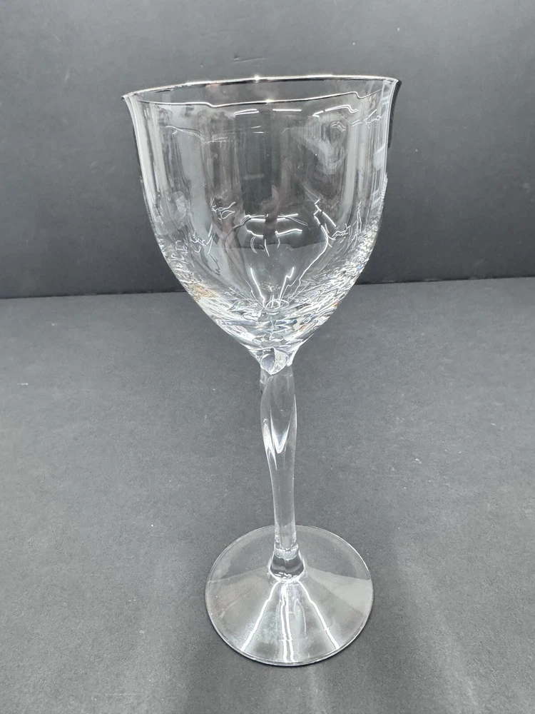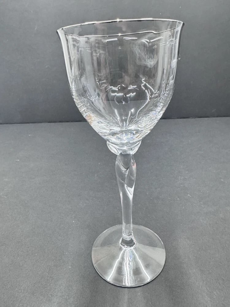 The Lenox Rhythm Platinum Water Goblet Glass is a vintage hand-blown piece from 1991, made in the USA. This elegant goblet features a contemporary style with a round shape and a twist stem etched with platinum trim. It has a 12 oz capacity and stands at 8.5" tall, making it suitable for various occasions. The swirl optic pattern adds a touch of sophistication to the glossy finish, making it a stylish addition to any drinkware collection.