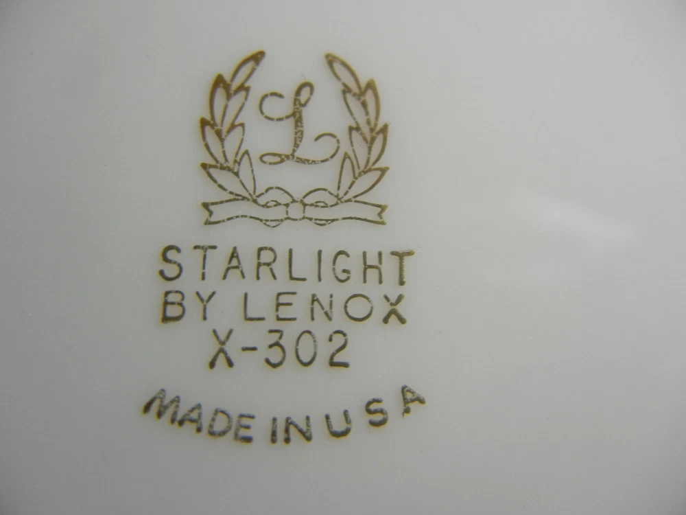 Manufacturer: Lenox China - Made in USA Pattern: Starlight - Pattern X302 - Gold Trim Item: Dinner Plate Size: 10 3/8" diameter Condition: Excellent Domestic shipping and shipping to Canada rates are quoted in the item description. We will ship international, contact us for rates.