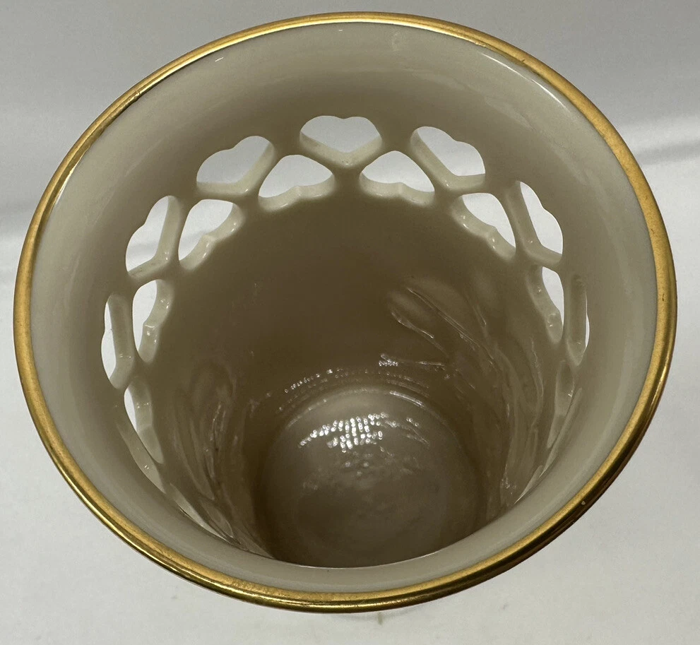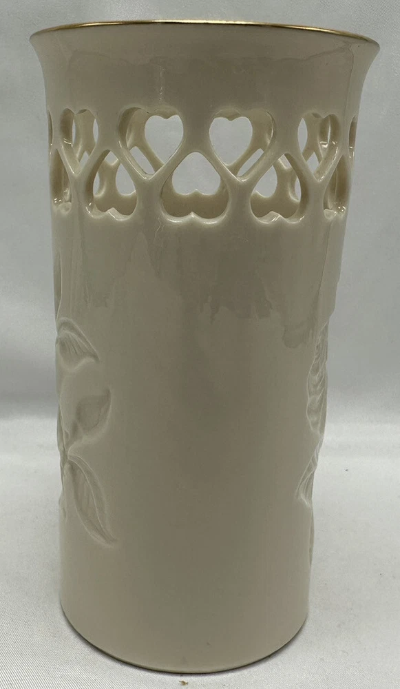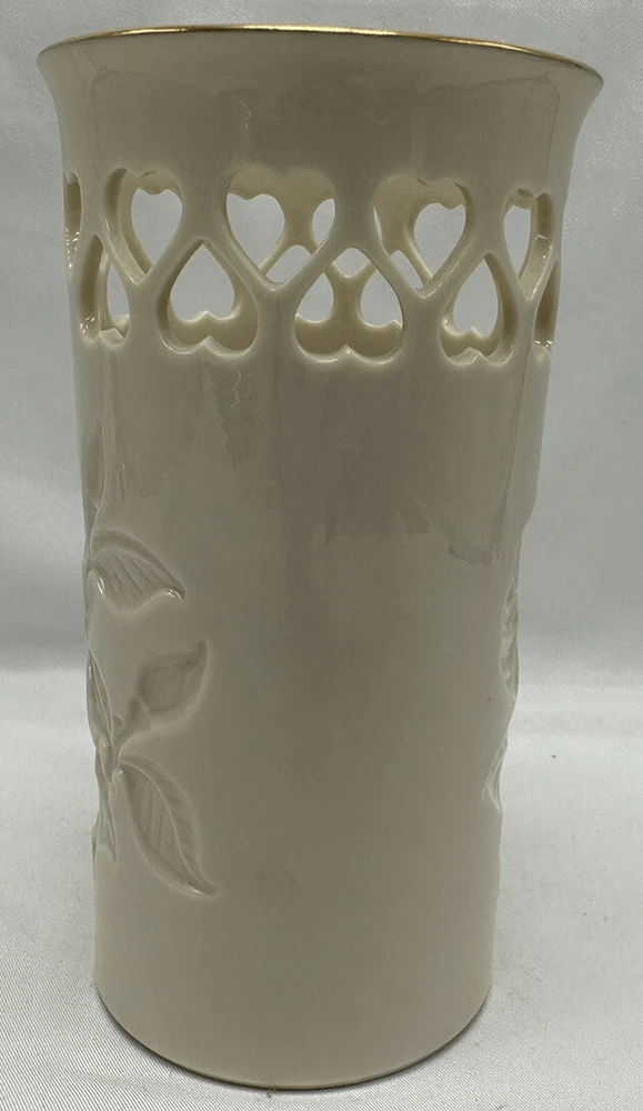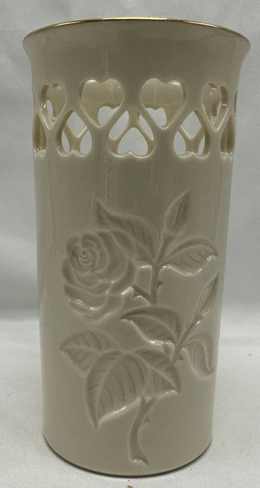 This Lenox USA vase is a beautiful addition to any home decor. The vase is made of high-quality porcelain material and features a glossy finish, making it perfect for indoor use. Measuring at 6 inches in height, this medium-sized vase is adorned with a rose pattern and a pierced hearts design that gives it a delicate and unique appearance. The vase is ideal for all occasions and can be used as a decorative collectible item that is sure to impress. It features a textured, reticulated relief that adds to its luminous look. This original Lenox vase is made in the United States and is perfect for those who love floral-themed decor.