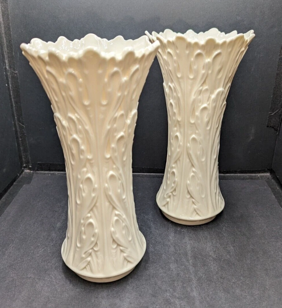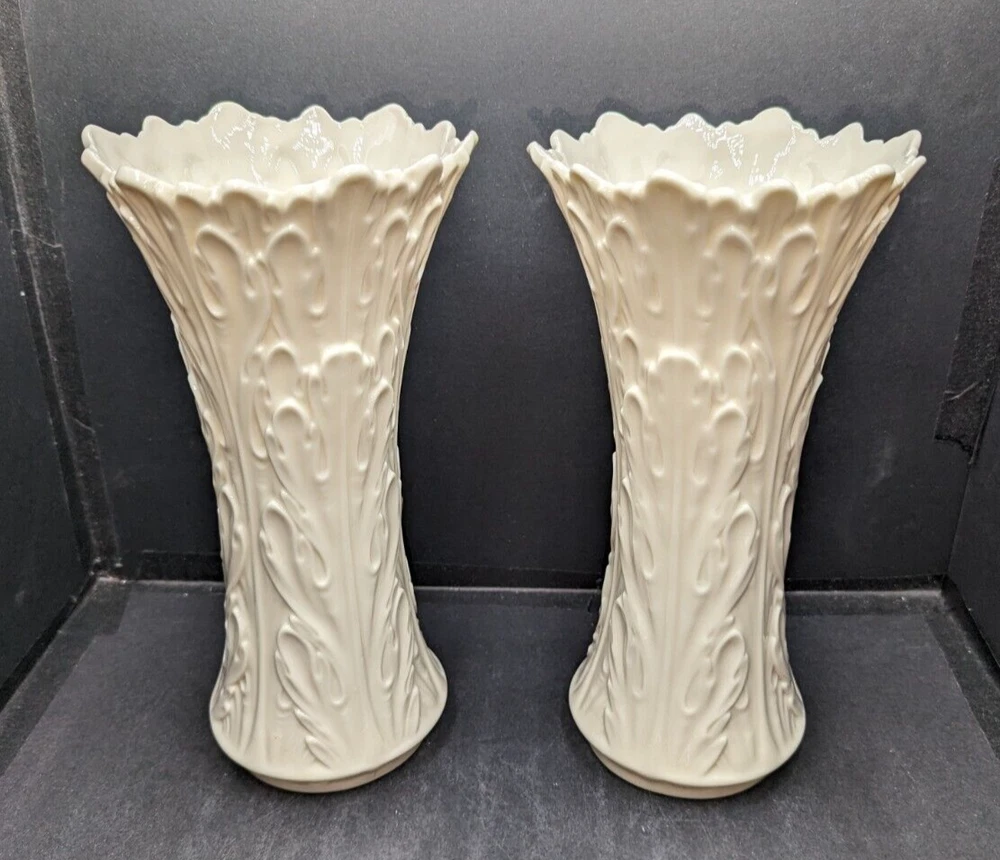 Lenox Woodland Collection Acanthus Leaf Vase 8.25" Off White Set of 2. Very nice pre-owned condition with no damage at all - they're beautiful! All of my items are carefully packed for shipping, no matter their value - $5 items are wrapped with the same care as a $200 item. My goal is to have your purchase arrive safely. I use recycled packaging when possible but mostly use new, high-quality products so your item will arrive intact without damage. Large, heavy and fragile items are harder to use combined shipping with but just ask if you would like to purchase more than one item and I am more than happy to do so if feasible. If not, maybe we can work out a shipping discount. Measurements are approximate or as close as I can get. Also, the color you see many not be the exact color depending on your computer or phone settings. I do my best to make sure that the colors look as accurate as possible on my end. Please note that I offer Priority Mail as well as Ground Advantage on most items. Check the pricing to see which you prefer. Thank you and hopefully you will visit my store again!
