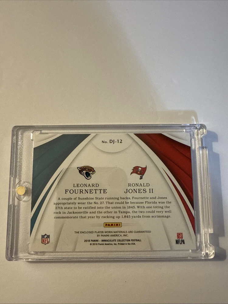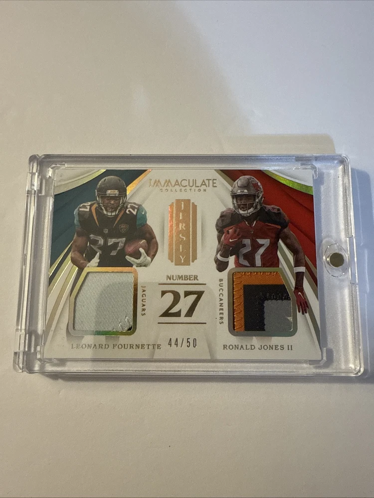 The product is a 2018 Panini Immaculate sports trading card featuring NFL players Leonard Fournette and Ronald Jones II. The card has a patch with a jersey number design, limited to 44 out of 50. It includes memorabilia from the Jacksonville Jaguars and Tampa Bay Buccaneers players, making it a rare and collectible item for football fans.