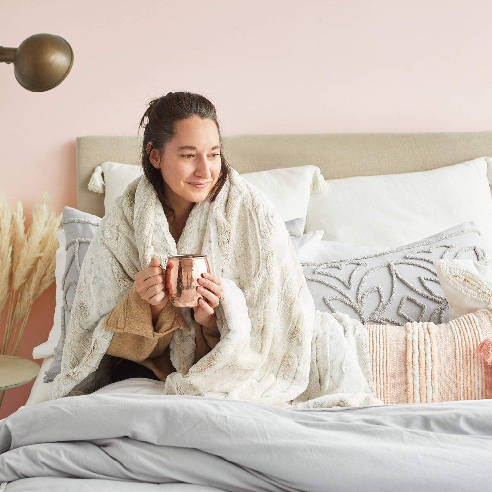 Your next cozy night in just got a stylish update with the super soft Snow Leopard Throw. With tones of ivory and natural hues this plush throw will complement your existing home décor. The faux fur finish has an irresistible soft texture which is perfect for curling up in when you need extra warmth. FAUX FUR BLANKET Get comfy and stay warm with our incredibly soft faux fur throw blanket; Reversible with fur on both sides SUPER SOFT THROW BLANKET Inspiring designs and exceptional fabrics create a luxurious look and feel SOFT & ELEGANT Cozy and comfortable, modernly vintage styling coordinates with most bedroom decors PERFECTLY LAYERED Experience a classic and simple look that transitions from season to season Includes 1 blanket; Measures 50 x 60; Machine washable