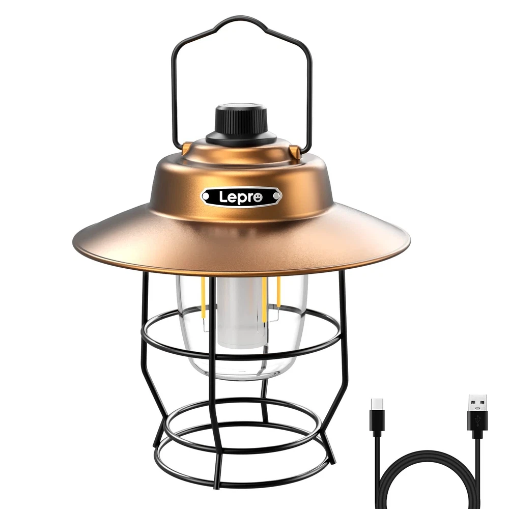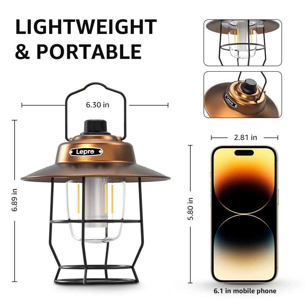 Lepro Vintage LED Camping Lantern Rechargeable, Power Bank, Christmas Decorations, Retro Style, Classic Railroad Lantern with Dimmable Control, Portable Hanging Tent Light for Camping, Power Outages Product Details Light Source Type: Light Emitting Diode (LED) Brand: Lepro Color: Bronze Power Source: USB Rechargeable Material: Acrylonitrile Butadiene Styrene (ABS) Product Dimensions : 6.3 x 6.3 x 6.89 inches; 10.58 ounces Item model number : PR330039 Batteries : 1 Lithium Ion batteries required. (included) Date First Available : October 26, 2022 Manufacturer : Lepro Country of Origin : China Customer Reviews: 4.6 4.6 out of 5 stars 148 ratings Product Dimensions: 6.3"L x 6.3"W x 6.89"H Battery Description: Lithium-Ion Brightness: 450 Lumen Item Weight: 0.3 Kilograms Mounting Type: Tabletop Mount Water Resistance Level: Waterproof Battery Life: 26.75 Hours Bulb Base: GU10 Number of Batteries: 1 Lithium Ion batteries required. (included) Specification Met: IPX3 Voltage: 5 Wattage: 6 watts Manufacturer: Lepro Part Number: PR330039 Item Weight: 10.6 ounces Country of Origin: China Item model number: PR330039 Batteries: 1 Lithium Ion batteries required. (included) Item Package Quantity: 1 Included Components: Batteries included Batteries Included?: Yes Batteries Required?: Yes Date First Available: October 26, 2022 Dimmable & Pleasant Bright. Rechargeable lantern comes with a dimming function and has 3 lighting modes (white light, warm light and warm white light). Just turn the top switch then smoothly dials from low light to high. The output ranging from 15LM to 450LM allows you to completely brighten your surroundings or simply set the mood. Long Battery Life & Emergency Charging. This LED camping lantern built-in rechargeable battery, which can be used for 50 hours on low or 3.5 hours on high after 4 hours of charging via a USB-C cable (included). And there are four LEDs that conveniently let you know how much charge left and charge in time. Lantern can also serve as a power bank for cell phones or mobile devices in emergency. Retro & Portable Design. 5.5*5.5*7.4 in, weighs only 0.88 pounds, lightweight and portable, you can easily carry the LED lantern to anywhere, not only on the tabletop, but also hanging on shepherd hooks, tents or branches. Vintage shape and texture resembling a traditional barn lantern, it is a nice companion for camping and outdoor dining or a peaceful evening stroll. Sturdy & Water Resistant. The outdoor Lantern is made from metal construction and seeded glass globe, high-quality iron protects the interior lighting cover, durable in nature and still function flawlessly from the backyard to the backcountry. Wide Application. This LED lantern is the perfect addition to any situation - can be used in garden, camping tent, emergency lighting, home power outage, Christmas party decoration, and enhances ambience by offering a soft, warm, unobtrusive glow. It is an ideal holiday gift for your family or friends.