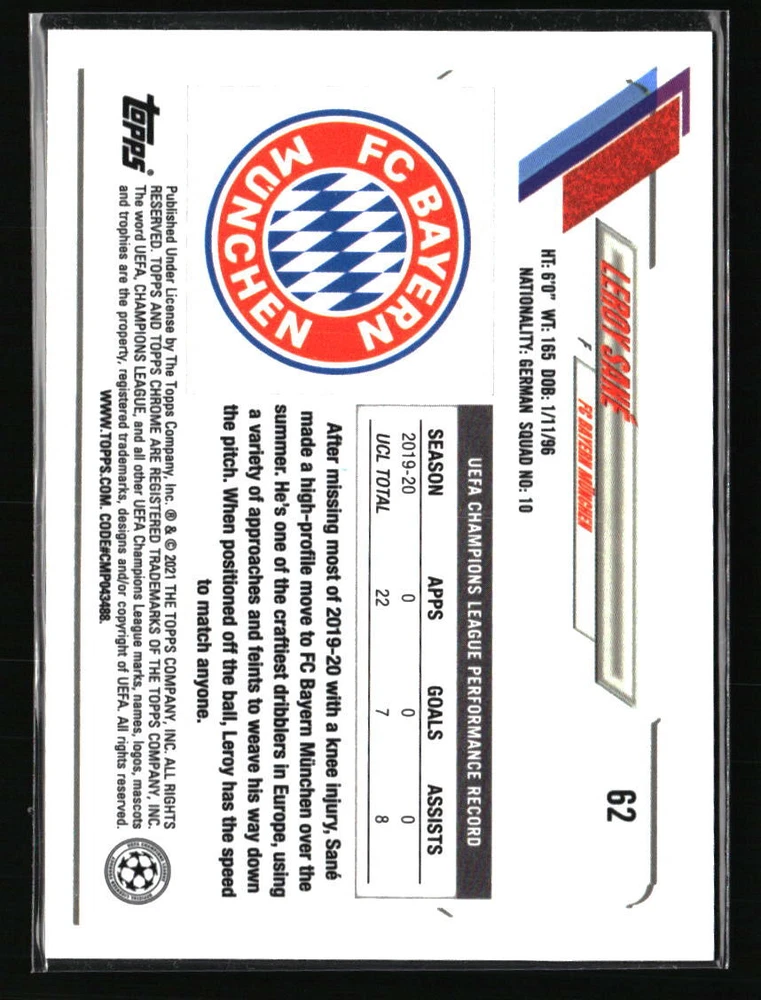 Leroy Sane 2021 Topps Chrome UEFA Champions League#62 Soccer Card