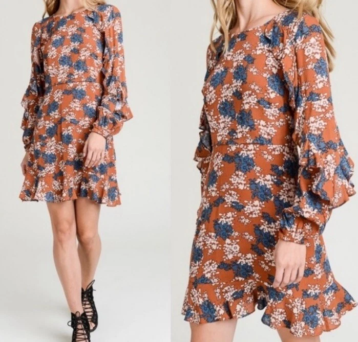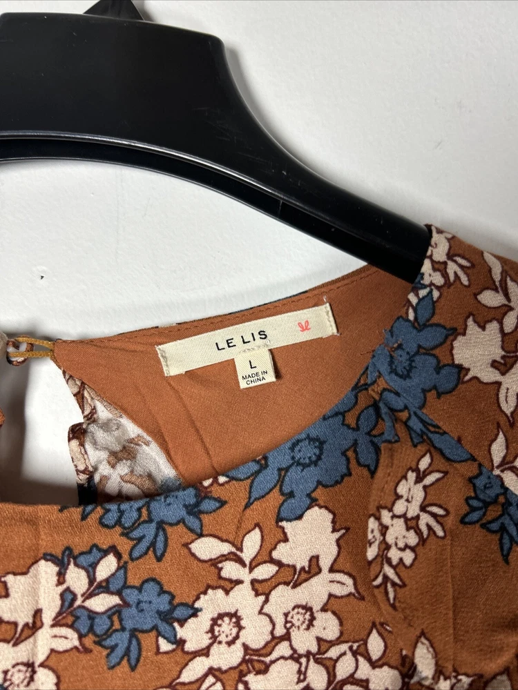 Les Lis Brown floral Long Sleeve Open Back Fall Dress Large. Condition is Pre-owned. Shipped with USPS Ground Advantage.
