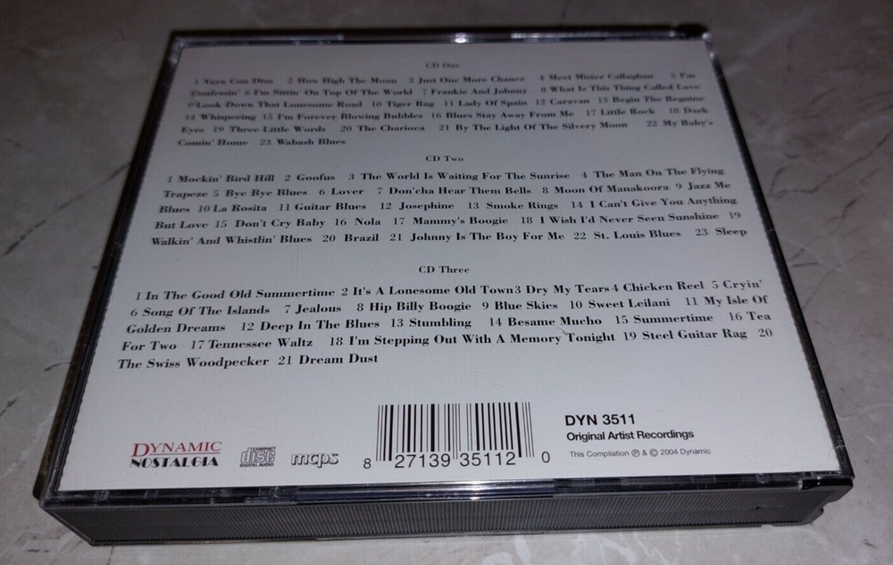 A 3 X CD ALBUM IN EXCELLENT CONDITION PRESENTED IN ORIGINAL FATBOX CASE LES PAUL & MARY FORD * HOW HIGH THE MOON * 1-1 Vaya Con Dios 1-2 How High The Moon 1-3 Just One More Chance 1-4 Meet Mister Callaghan 1-5 I'm Confessin' 1-6 I'm Sitting On Top Of The World 1-7 Frankie & Johnny 1-8 What Is This Thing Called Love 1-9 Look Down That Lonesome Road 1-10 Tiger Rag 1-11 Lady Of Spain 1-12 Caravan 1-13 Begin The Beguine 1-14 Whispering 1-15 I'm Forever Blowing Bubbles 1-16 Blues Stay Away From Me 1-17 Little Rock Getaway 1-18 Dark Eyes 1-19 Three Little Words 1-20 The Carioca 1-21 By The Light Of The Silvery Moon 1-22 My Baby's Comin' Home 1-23 Wabash Blues 2-1 Mockin' Bird Hill 2-2 Goofus 2-3 The World Is Waiting For The Sunrise 2-4 The Man On The Flying Trapeze 2-5 Bye Bye Blues 2-6 Lover 2-7 Don'cha Hear Them Bells 2-8 Moon Of Manakoora 2-9 Jazz Me Blues 2-10 La Rosita 2-11 Guitar Boogie 2-12 Josephine 2-13 Smoke Rings 2-14 I Can't Give You Anything But Love 2-15 Don't Cry Baby 2-16 Nola 2-17 Mammy's Boogie 2-18 I Wish I'd Never Seen Sunshine 2-19 Walkin' And Whistlin' Blues 2-20 Brazil 2-21 Johnny Is The Boy For Me 2-22 St. Louis Blues 2-23 Sleep 3-1 In The Good Old Summertime 3-2 It's A Lonesome Old Town 3-3 Dry My Tears 3-4 Chicken Reel 3-5 Cryin' 3-6 Song Of The Islands 3-7 Jealous 3-8 Hip Billy Boogie 3-9 Blue Skies 3-10 Sweet Leilani 3-11 My Isle Of Golden Dreams 3-12 Deep In The Blues 3-13 Stumbling 3-14 Besame Mucho 3-15 Summertime 3-16 Tea For Two 3-17 Tennessee Waltz 3-18 I'm Stepping Out With A Memory Tonight 3-19 Steel Guitar Rag 3-20 The Swiss Woodpecker 3-21 Dream Dust THANKS FOR LOOKING!!!!!!!!!!