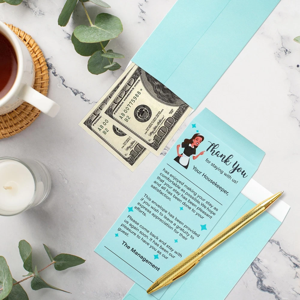 【Sufficient Quantity】There are a total of 100 pieces of housekeeping thank you tip envelopes,measuring about 6.3 x 3.15inch/160 x 80mm,you can use it to store coins,cash and others small items without taking up too much space,easy to carry and pass on,sufficient quantity can meet your daily use and Replacement needs. 【Quality Material】Our cash self adhesive tip envelopes are made of quality paper material,good texture,not easy to break,with clear printing,and not easy to fade,the gratuity envelopes for cash is nontransparent,which can protect you well privacy.So you can use them with confidence for a long time. 【Exquisite Design】The housekeeping tip envelopes are printed in blue ink,looking fresh and elegant,with a delicate and beautiful appearance, printed with thank text for the room service staff,suitable for most people.You can write your name in the blank space to express your gratitude to thank customers and leave a subtle reminder to tip you. 【Wide Application】These housekeeping thank you tip envelopes are suitable for hotel,motel,apartments,inn,resorts and more,not only for storing thank you tips for housekeeping staff,maids and cleaners,but also for banknotes,checks,stamps,gift cards,jewelry and trinkets and so on.Greatly increasing the chances of getting housekeeping tips. 【Easy to Use】The Housekeeping thank you tip envelopes adopts self adhesive design and is easy to seal,just wet the glue on the envelope, then fold and press it for a few seconds, practical and convenient; They are sticky enough to keep the contents of the envelope from loss.
