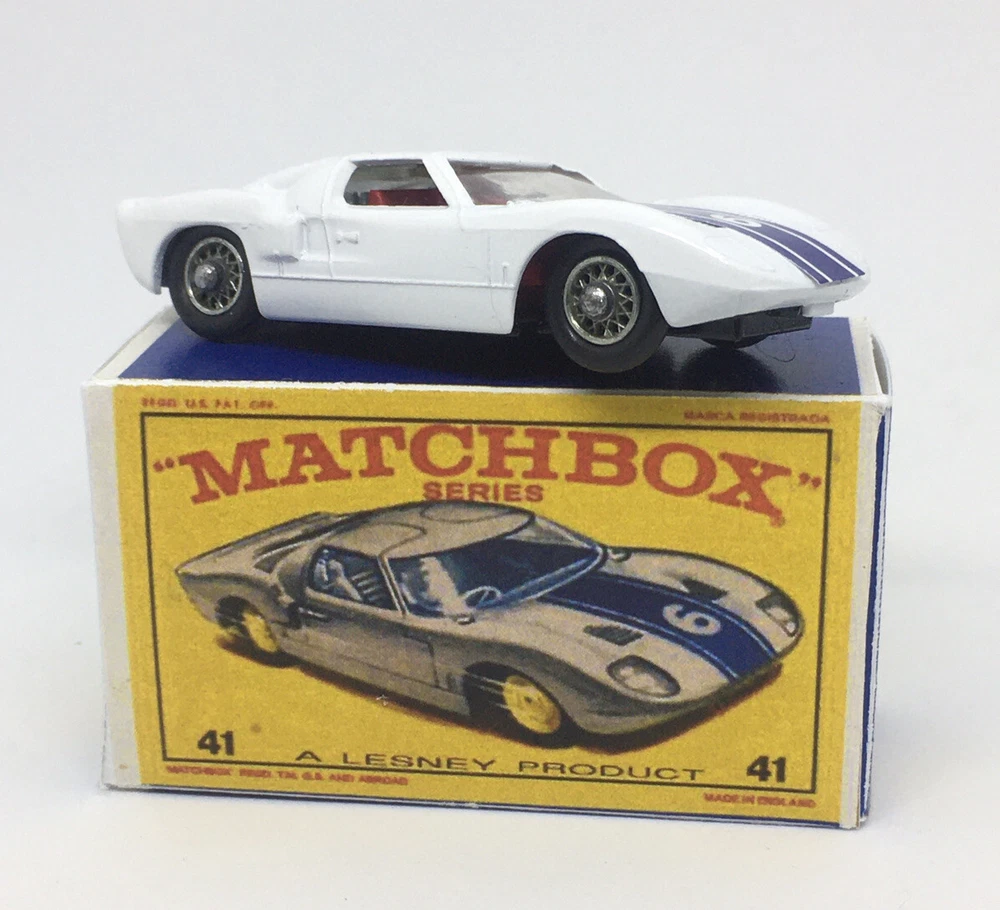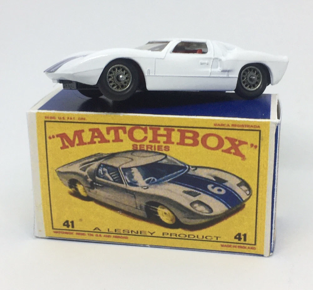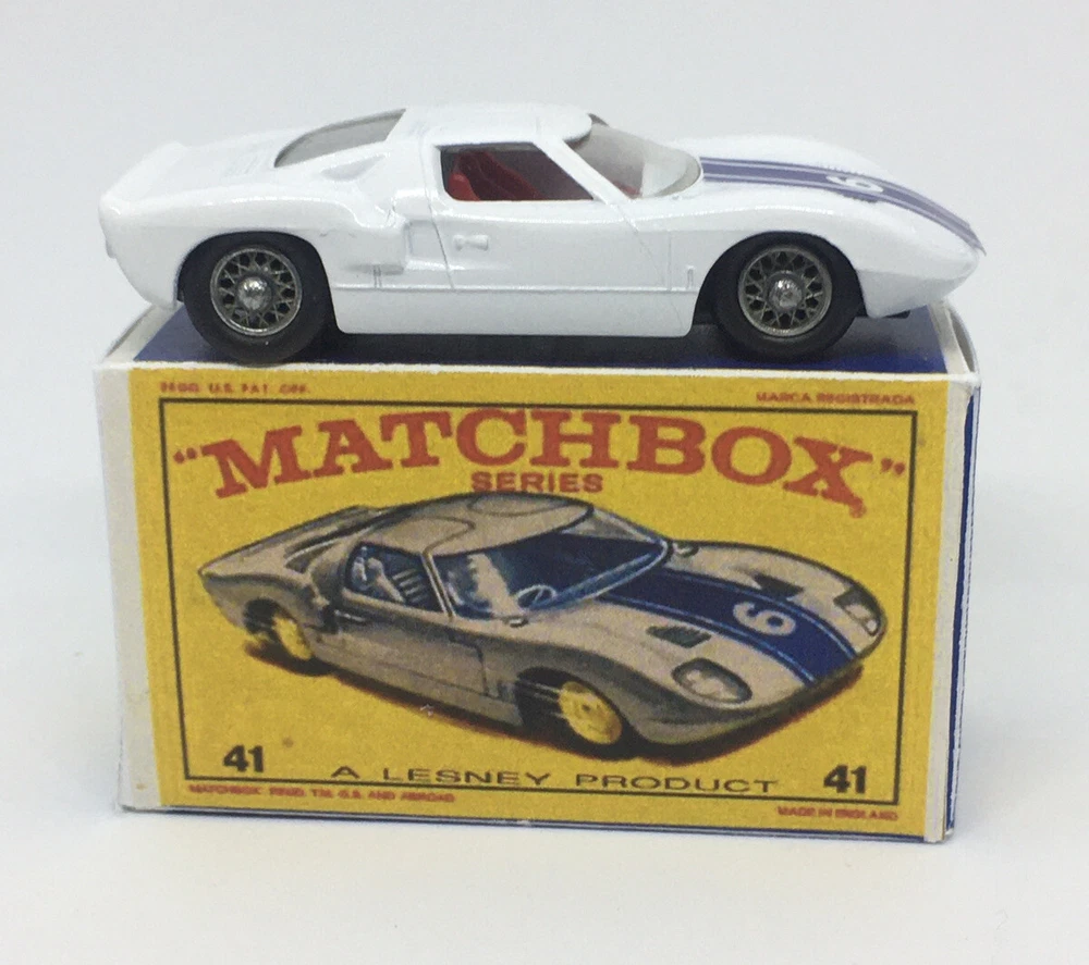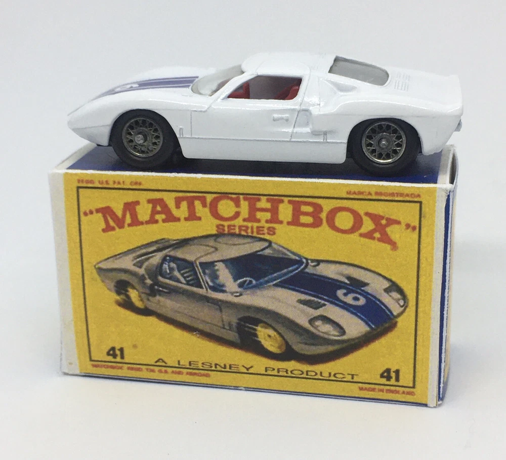 Vintage Lesney Matchbox 41 Custom GT 40 With spoke wheels. RESTORED, NOT ORIGINAL. I restored the vehicle to a high standard. These models and packaging are not original. Please look at the pictures carefully as they are part of the description. Please ask questions before bidding. I combine shipping with multiple orders. These are custom models so I do not except returns. This is a hobby and the vehicle was a used played with toy now restored.