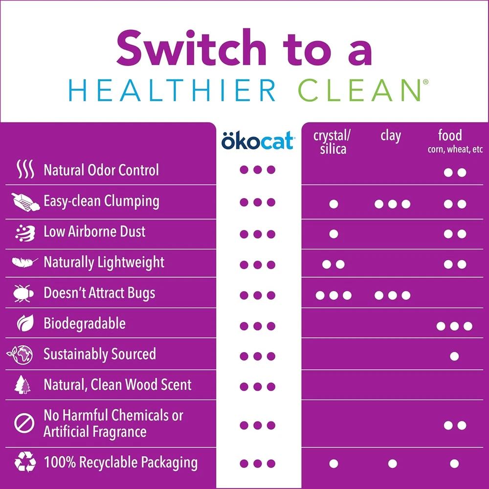 PELLET CAT LITTER: Our next-generation, clumping cat litter mini-pellets are exceptionally absorbent to clump solid and stop odors, and are less likely to stick to your cats' fur or track through the house EXCEPTIONAL ODOR CONTROL: Wood fiber naturally prevents enzymes from bonding with liquid & waste to stop the creation of ammonia & odor CLUMPING LITTER: Pellet litter absorbs liquid on contact, forming solid, easy-to-scoop clumps that make cleaning the litter box quick and easy 99% DUST FREE FOR A HEALTHIER HOME: Our low-dust cat litter is made from clean wood fiber that has been screened and de-dusted for a cleaner pour and a healthier home and no dirty clay dust PLANT-BASED LITTER: Our sustainable cat litter is free of artificial fragrance, harmful chemicals, toxic dyes, and mined clay or silica; unlike clay, our biodegradable cat litter degrades quickly and cleanly Alleviate the constant sweeping and vacuuming with a premium natural litter that's cleaner and healthier for your cat, family and home. ökocat less mess, low tracking cat litter is made from dense, mini-pellets that are soft on paws, and less likely to scatter out of the litter box or track through the house like finer litters. It's also a great choice for long hair cats. ökocat is relentless at controlling odor, along with a fresh natural scent reminiscent of the great outdoors. Made entirely from sustainably sourced, responsibly rescued natural wood fiber, ökocat offers the brilliance of European engineering for a better performing litter. The online excusive box does contain an inner plastic bag liner to help prevent leaking and any moisture. This bag is recyclable with #4 for drop-off plastic recycling or pick up services like Ridwell.