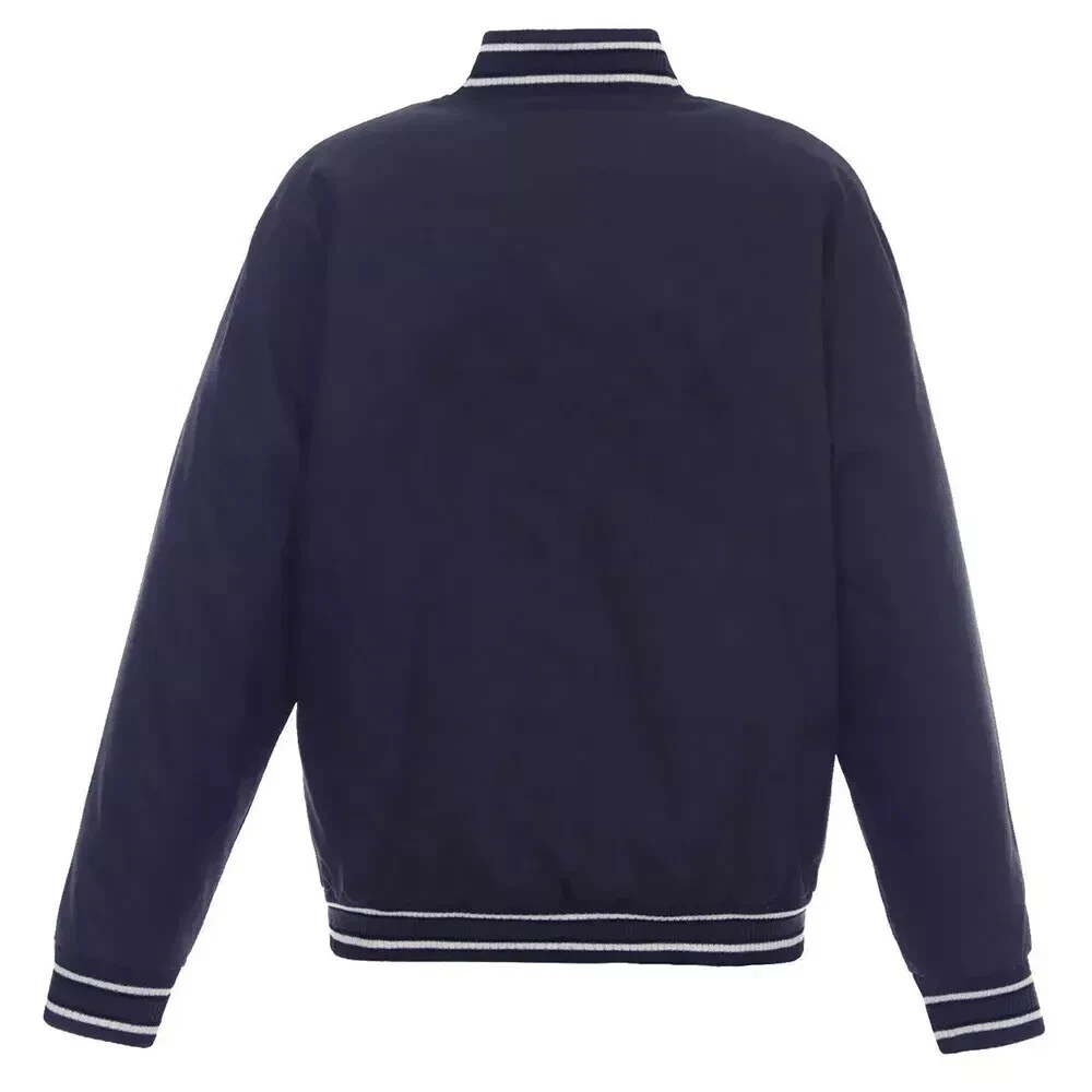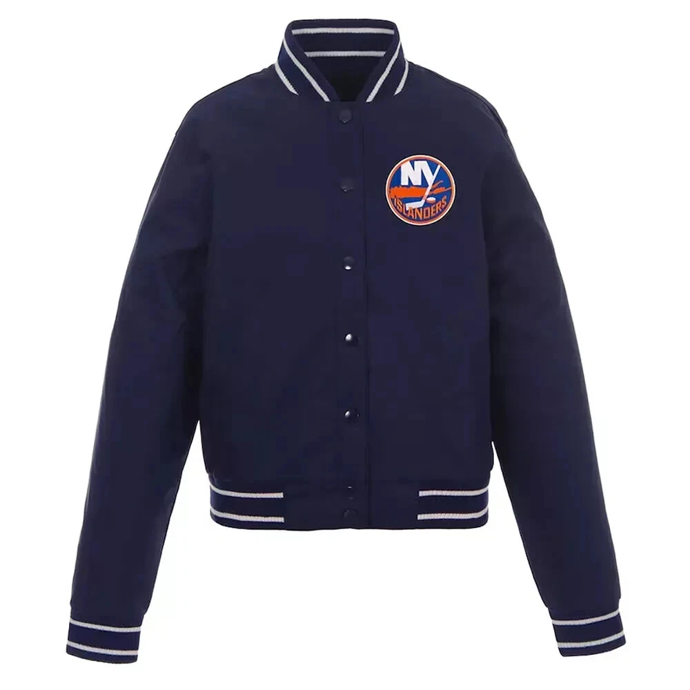 Letterman New York Islanders Navy All Wool Varsity Jacket Product Specifications Material: wool Inner: viscose lining Color: Navy Blue Collar: rib knitted Front: snap tab closure Sleeves: full in length Cuffs: rib knitted Two waist pockets Rib knitted hemline Fine quality stitching