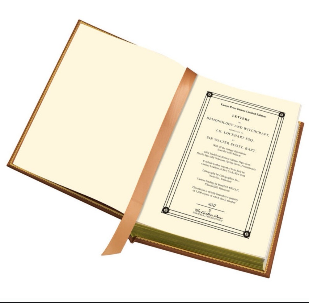 **Limited to 1,200 hand-numbered copies.** Rare, still factory sealed, and brand new. Perfectly reproducing the 1830 edition illustrated by George Cruikshank. The fascinating exploration of witchcraft and the supernatural world by the great author Sir Walter Scott. This highly influential book sparked the 19th century interest in esoteric matters. This extra illustrated edition includes 12 color images by George Cruikshank, who illustrated many of Charles Dickens’s novels. Includes a unique custom-crafted cloth-bound double slipcase. Features include: Fully bound in genuine leather. Limited to 1,200 hand-numbered copies. 22kt gold deeply inlaid on the "hubbed" spine. Unique custom-crafted cloth-bound double slipcase. Superbly printed on acid-neutral paper that lasts for generations. Sewn pages — not just glued like ordinary books. Handsome printed endpages and a satin-ribbon page marker. Printed and bound in the USA. Imported materials. Rigorous inspection at every stage ensures adherence to our exacting standards. Superb craftsmanship and commitment to quality.