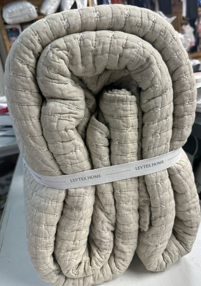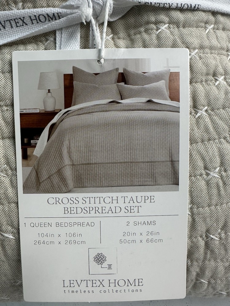 The LevTex Home Cross Stitch Taupe Bedspread Set is a modern and stylish addition to any bedroom, featuring a solid beige color with a quilted design. Made of cotton with 100% blended fiber batting, this Queen-sized set includes a bedspread and pillow shams, perfect for teens and adults alike. Easy to care for with machine wash instructions, this rectangular bedspread set adds a touch of elegance to your room with its standard certification and unique stitch character.