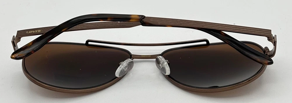 This is brand new Levi Sunglass. , It has full brown plastic temples, Normal retail was about $75.00. Brown Metal Aviator RXable Sunglasses , This comes with a plain black eyewear pouch, Size: 58. 15. 140, Height: 44mm, Tortoise Plastic Temples , Adjustable Plastic Nose Pads , Regular Retail: $75.00 You Pay: $24.99 Brown Gradient Lens, You Pay Only $24.99 Now,