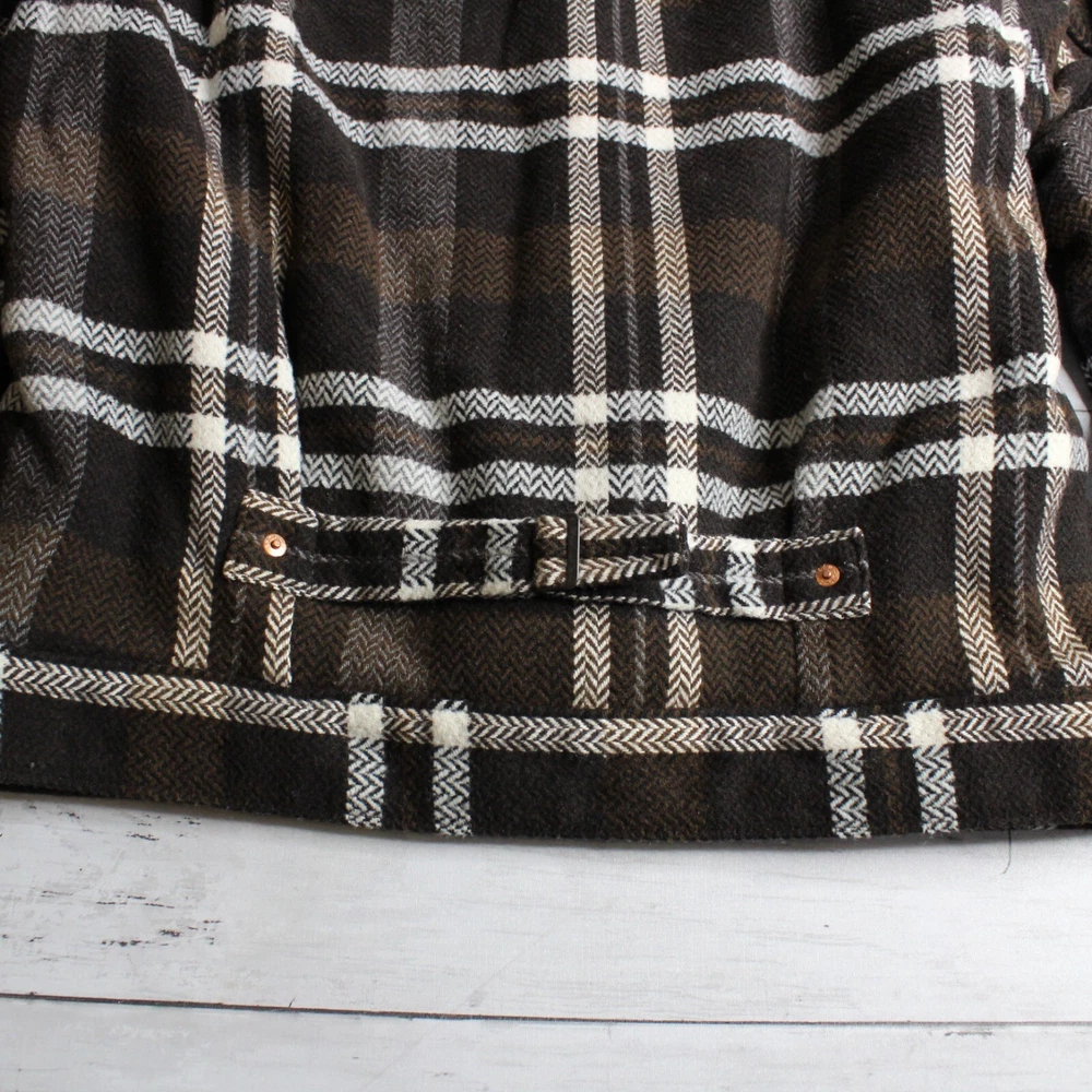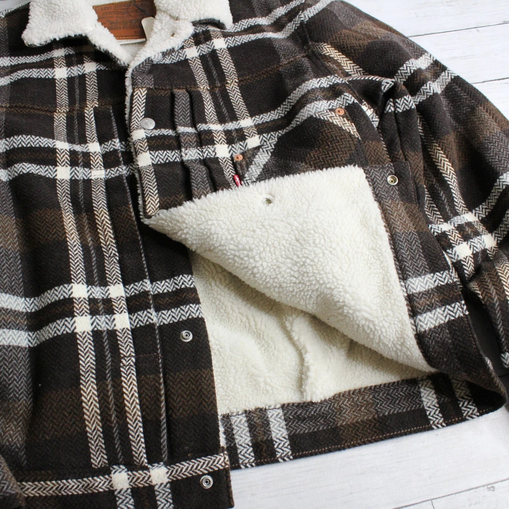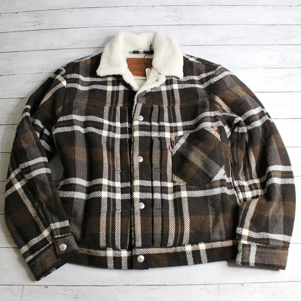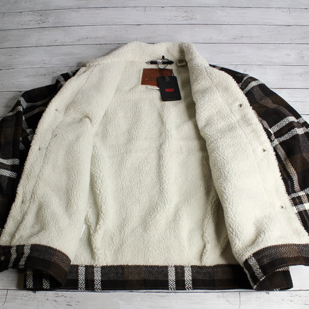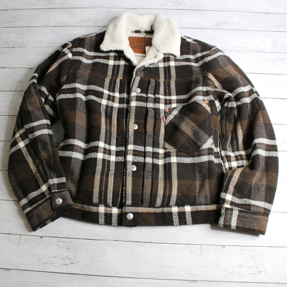 New with Tags Levi Strauss & Co Genuine Quality Clothing Wool Blend Trucker Jacket Brown and Ivory Plaid Shell: 84% Polyester 16% Wool Lining: 100% Polyester Sherpa Fleece Fall Winter Men's Size L Large This Levi's coat is brown and cream plaid with a collar and snap front. It is lined with faux shealing and is cozy for cold weather. It is extremely nice quality and is brand new with tags. Approximate Measurements Chest 25 1/2" from armpit to armpit, lying flat Length 26 1/2" from shoulder to hem