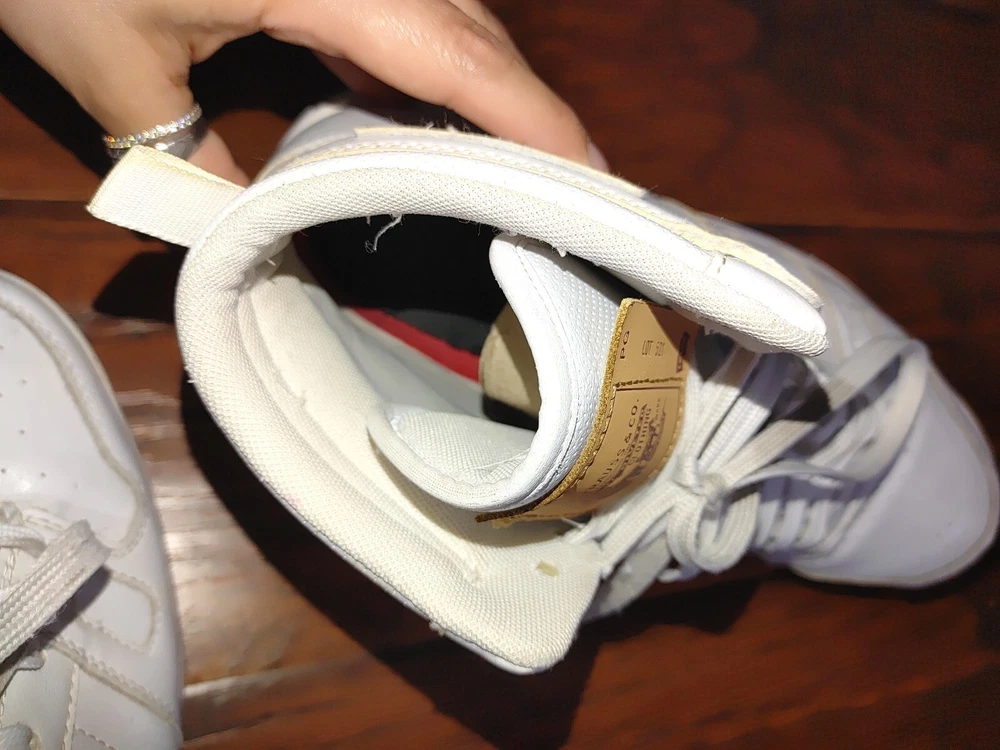 Levi Strauss all white high top sneakers. Size 9.5 men's. Pre-owned. Red brand tag on both shoes and big brand patch on tongue. Original laces and shoes show signs of wear. Some light red tint on inside/outside of one shoe. Attention: Vintage/thrifted items can have loose threads, faded colors, discoloration, pilling, and/or mild odors. Major defects will be listed. Some specialty fabrics, NWT items, or bulkier items may not be washed. All questions related to color, size, or condition prior to purchase.
