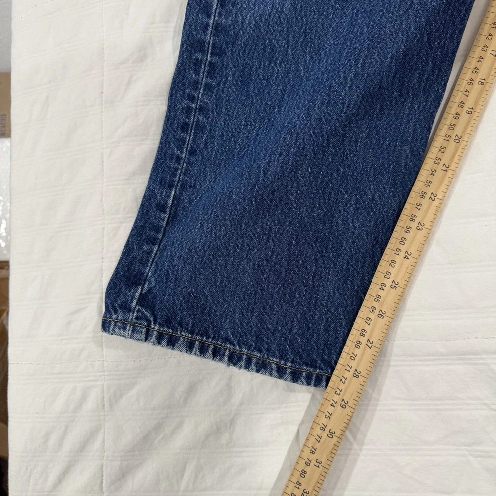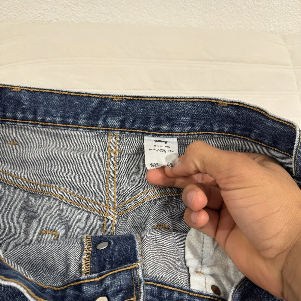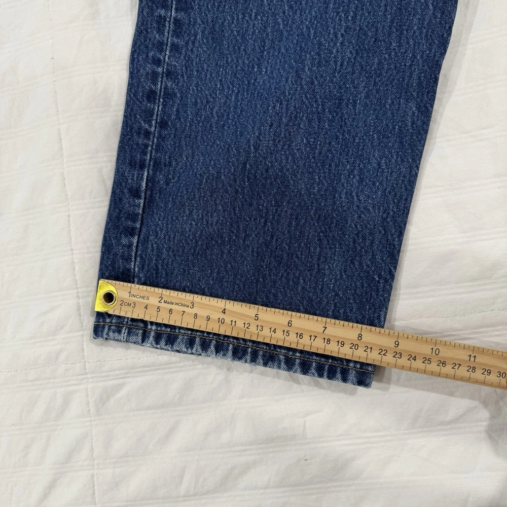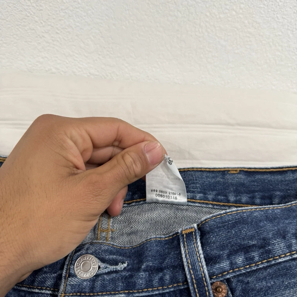 The Levi's 501 Blue Jeans are a vintage pair of denim pants in a medium wash. They feature a straight fit with a 38-inch waist and a 29-inch inseam. Made from cotton denim, these jeans have a classic button closure and a Levi's logo accent. The design includes wallet whiskering and fading for a worn-in look, perfect for a timeless and stylish addition to any wardrobe.