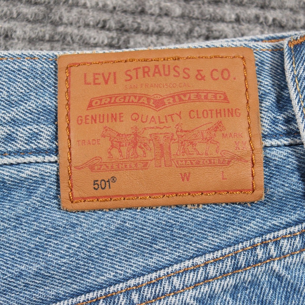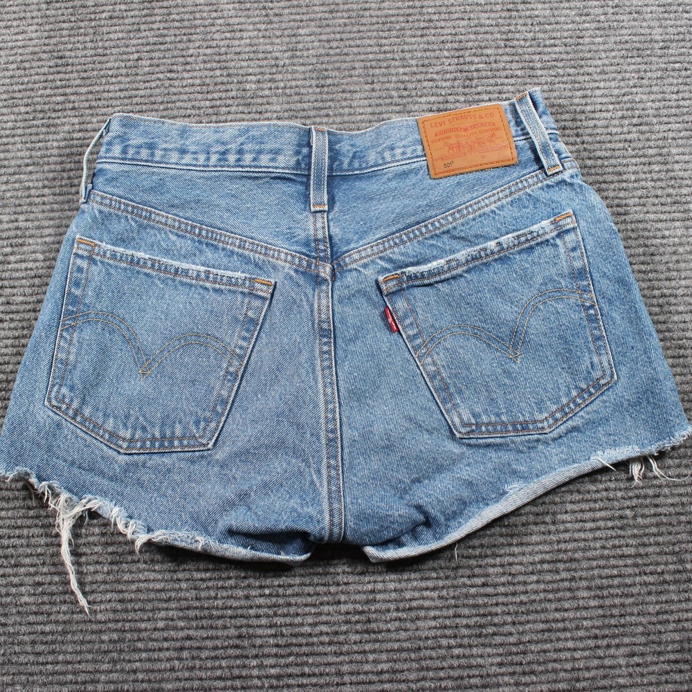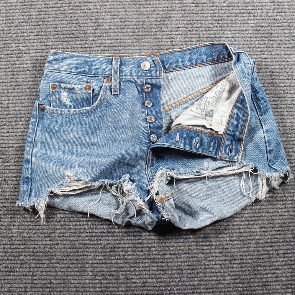 Levi’s Premium 501 denim shorts in a light/medium blue wash with heavy distressing and a raw, frayed hem. 100% cotton—no stretch—for that true vintage rigid feel; classic 5-pocket cut. Tagged W27, which fits about a women’s 4. Dress them up with a bodysuit or down with a band tee; perfect warm-weather staples. Color may vary slightly from photos due to lighting and monitor settings. Details: Brand/Model: Levi’s Premium — 501 Original Shorts Style: High rise, distressed, raw/frayed hem, 5-pocket Color/Wash: Light/Medium Blue Size: W27 (≈ Women’s 4) Fabric: 100% Cotton (rigid) Condition: Pre-owned; intentional distressing and fray, no structural issues noted Key Note: Classic 501 leather patch; Levi’s tab; premium rigid denim
