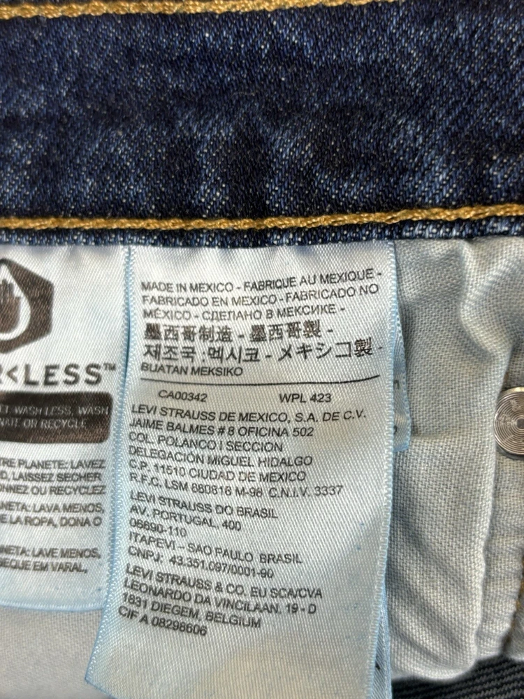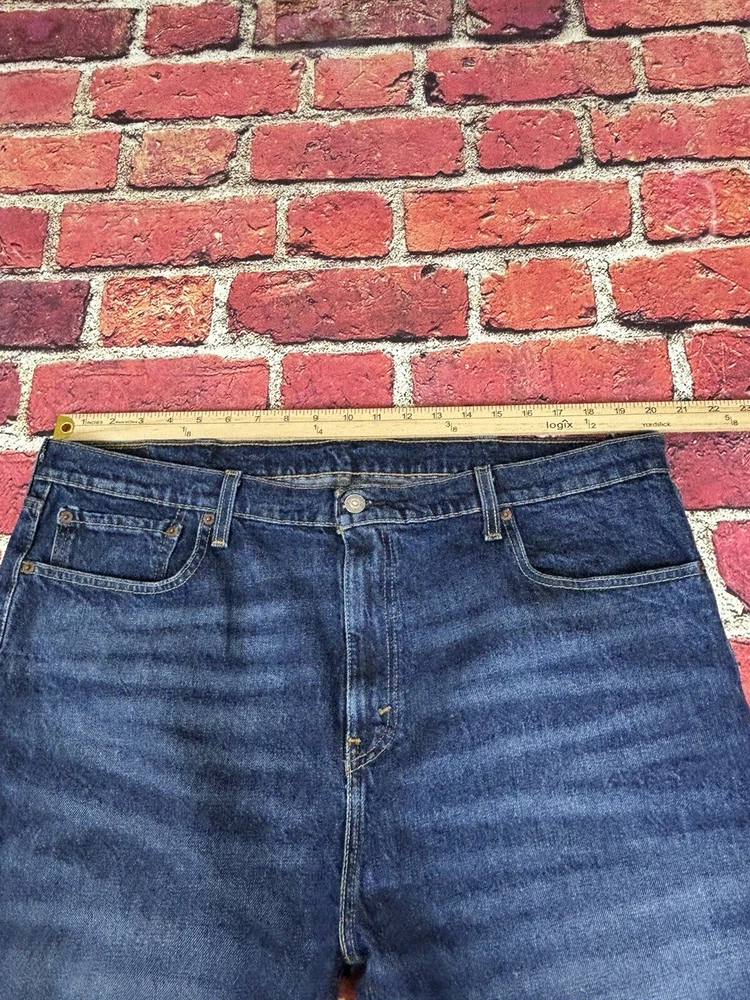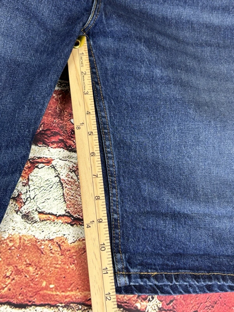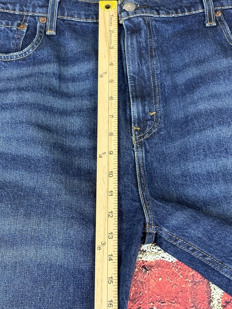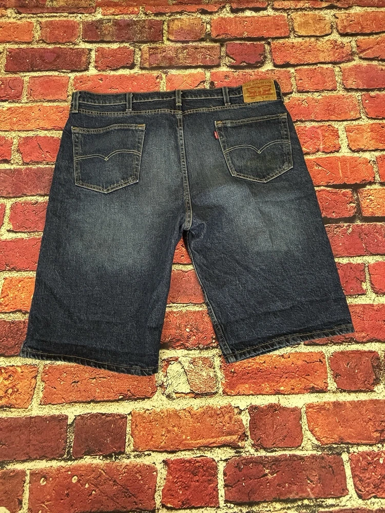 Levi's 502 Tapered Fit Denim Black Jean Shorts for men in size 33 with a distressed dark wash. These vintage-inspired shorts have a regular fit, high rise, and zip closure. Made from a cotton blend fabric, they feature a classic 5-pocket design with belt loops. The shorts have a 12-inch inseam and are designed with a Western, USA, and Rodeo theme.