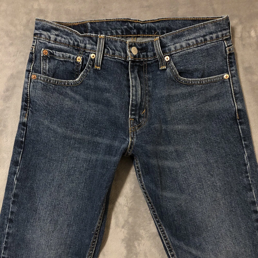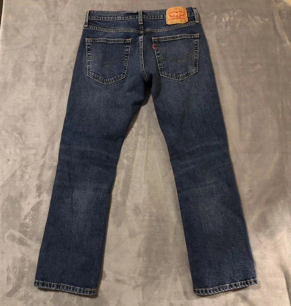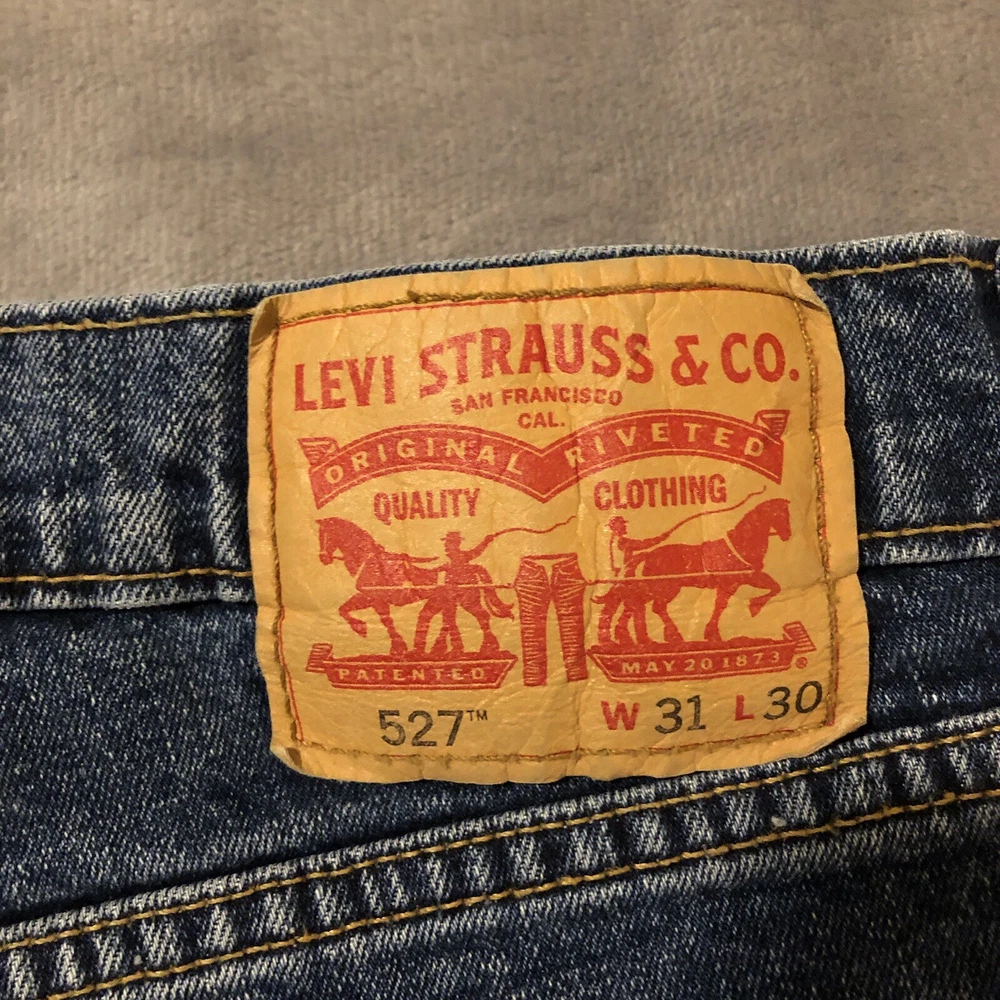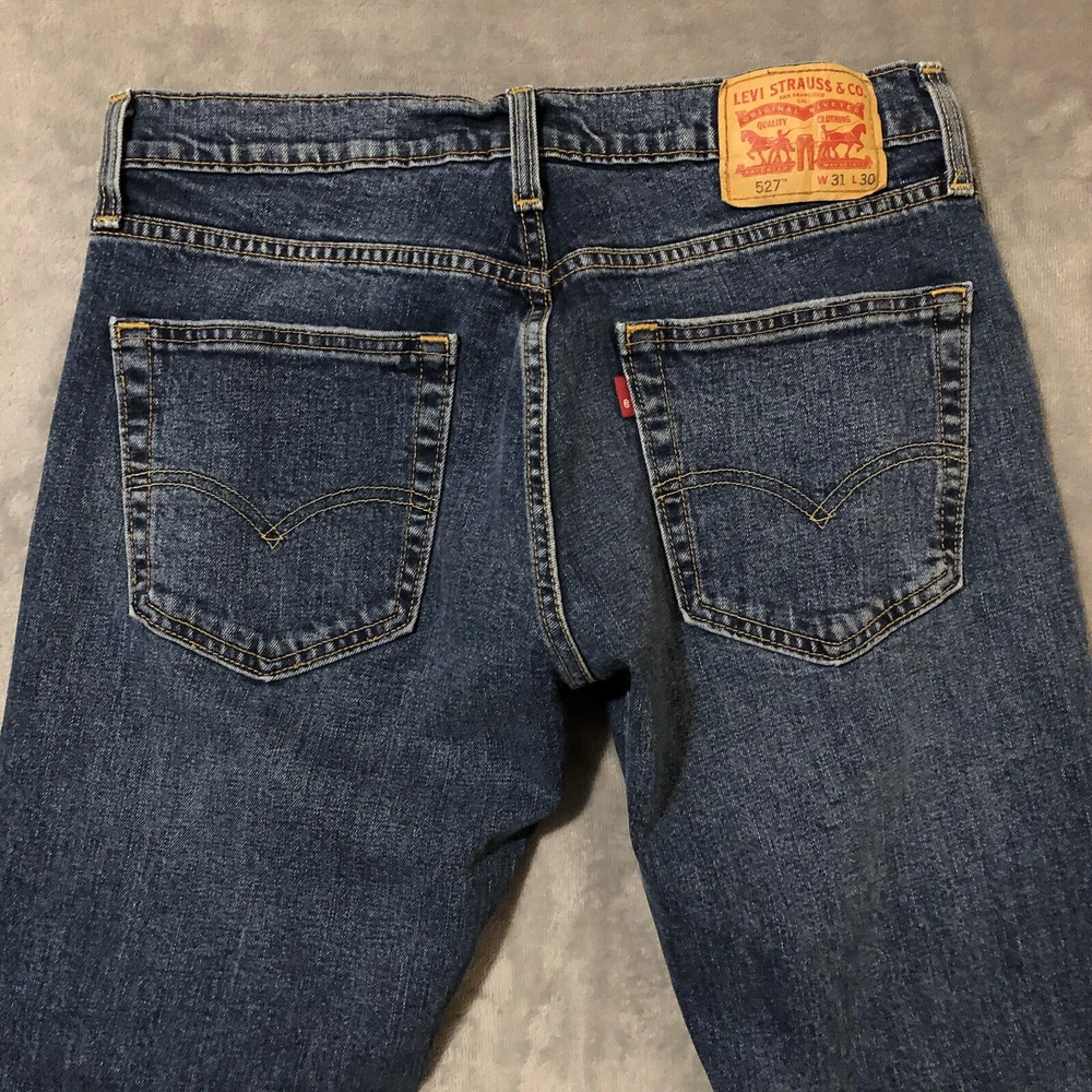 Levis 527 Jeans Mens 31x30 Slim Boot Cut Low Rise Blue Denim Measure 32x29.5 Jeans are in good pre-owned condition with mild wear to the front pocket edges and hems, see photos. Mild scent of fabric softener.