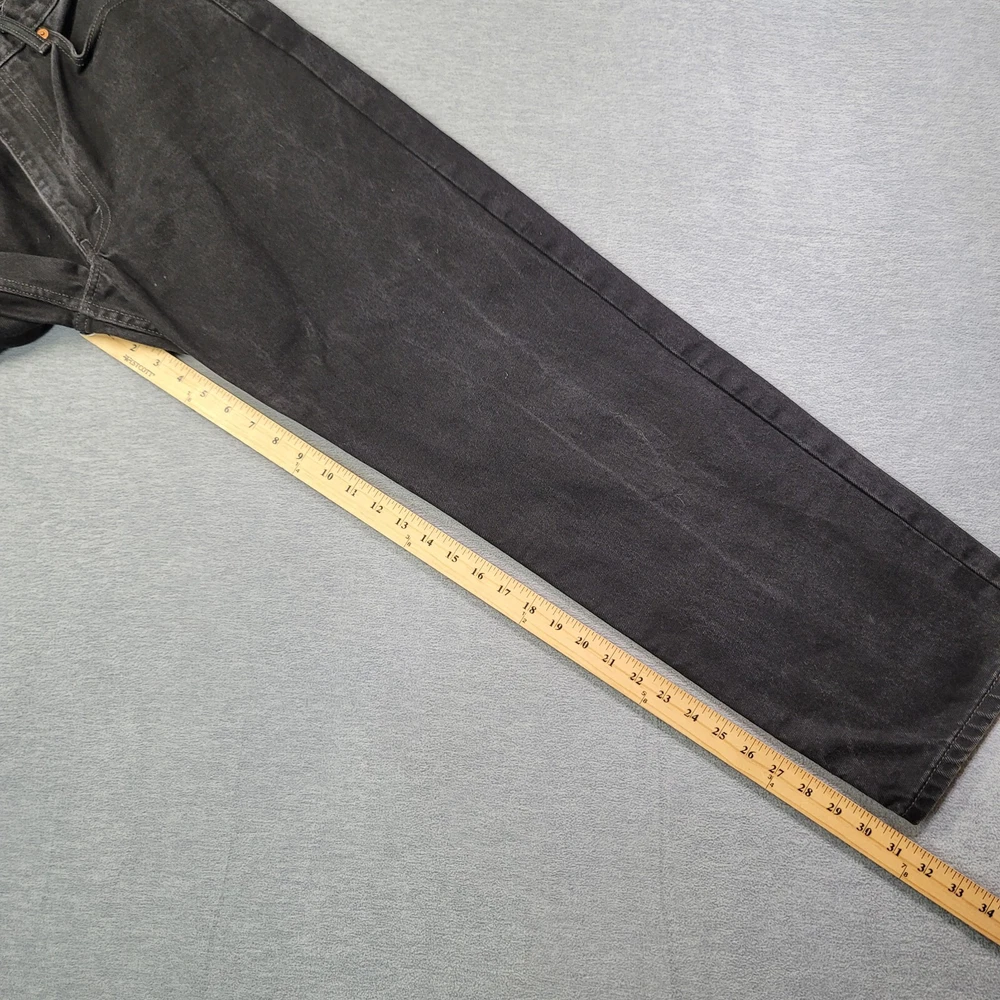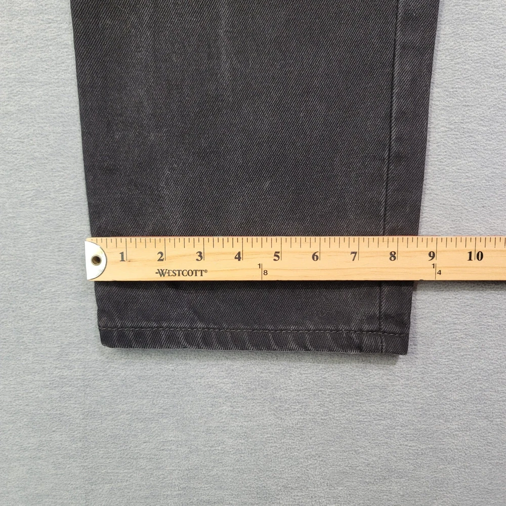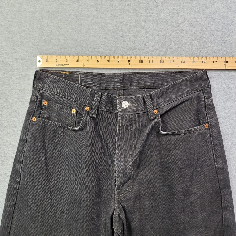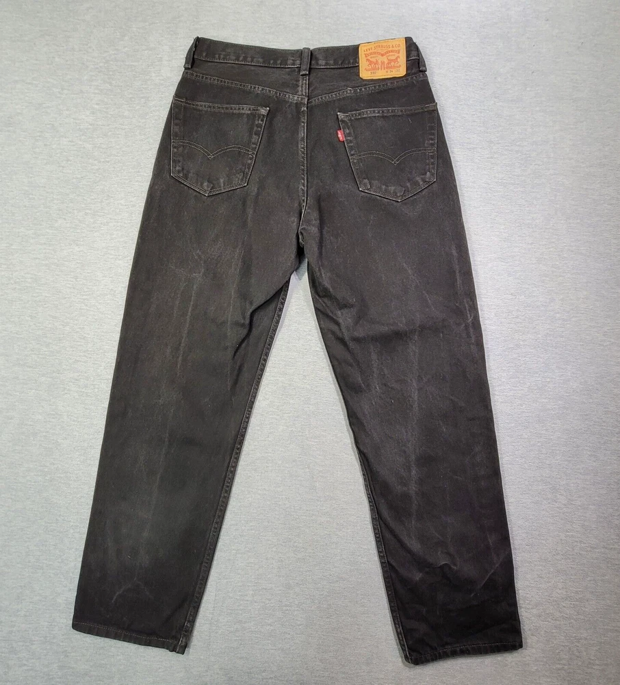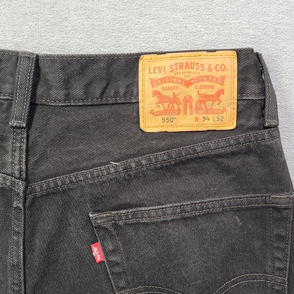 The Levi's 550 Men's Jeans in size 34x32 are made of black cotton denim with a relaxed fit and straight leg style. These mid-rise jeans feature a zip closure and are part of the Levi's 500 Series, perfect for a grunge or skate-inspired look. The brand Levi's is known for its quality and timeless designs, making these jeans a versatile and stylish addition to any wardrobe.