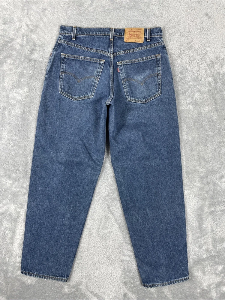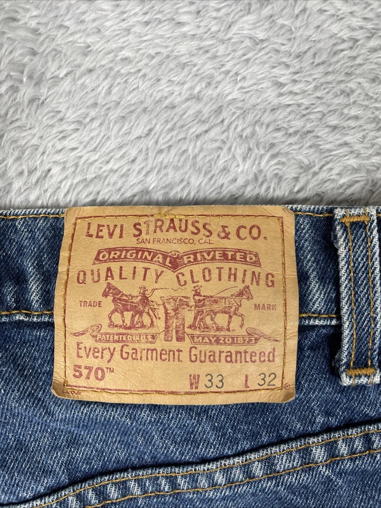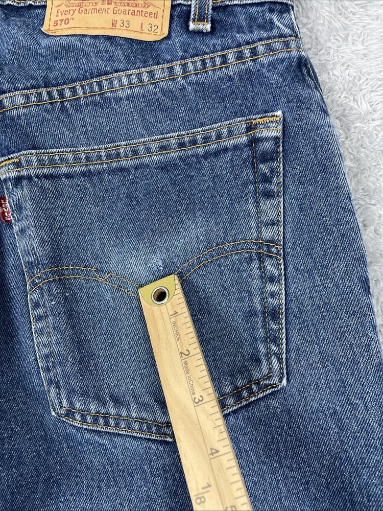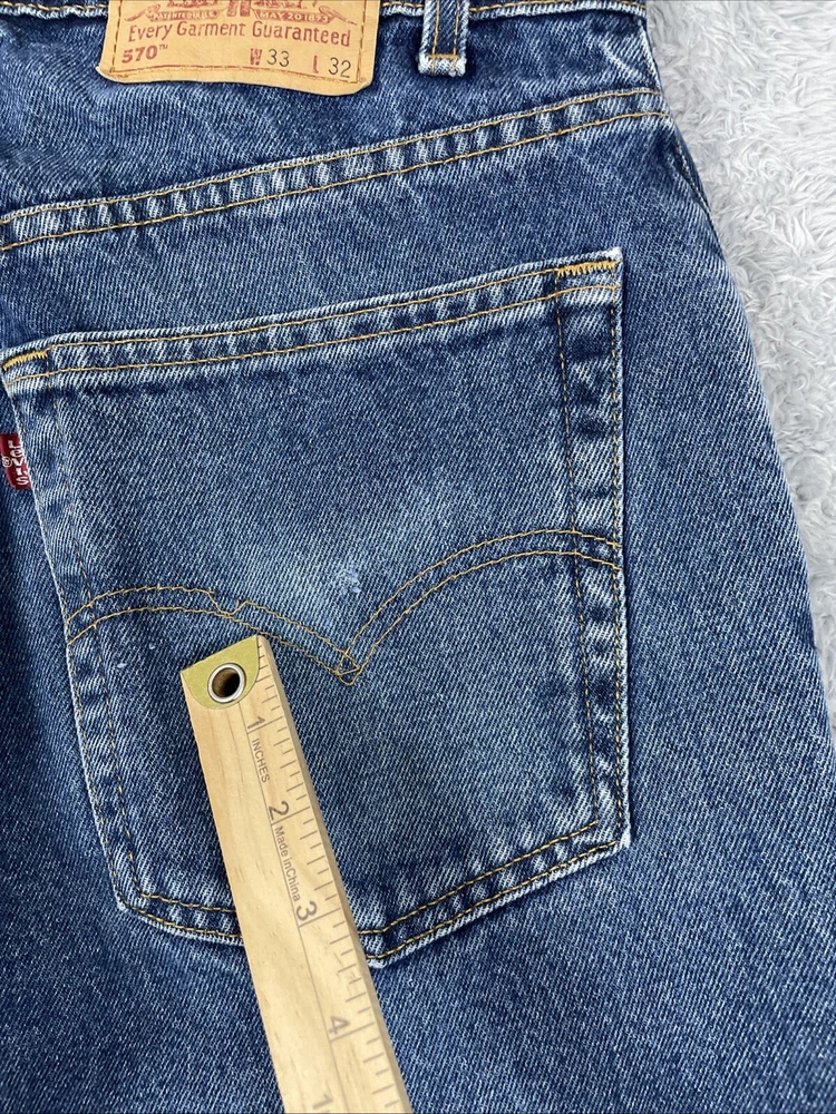 Levis 570 Jeans Men's 33x32 Blue Vtg. Baggy Fit 100% Cotton Pants Mexico Made Tag size is - 33 x 32 *ACTUAL measures are* - ~33 x 31.5 See photos for actual measurements. Condition is used: Acceptalbe used condition with stains on the thighs, a worn spot on the back pocket, and some loose decorative stitching on the back pocket Please look carefully at all photos. The photos are an important part of the description. If you have questions, please ask. Returns are accepted within 30 days of purchase. The item must be returned in exactly the same condition as received. Items will be inspected, serial numbers checked, etc. Shipping fees are not refundable.