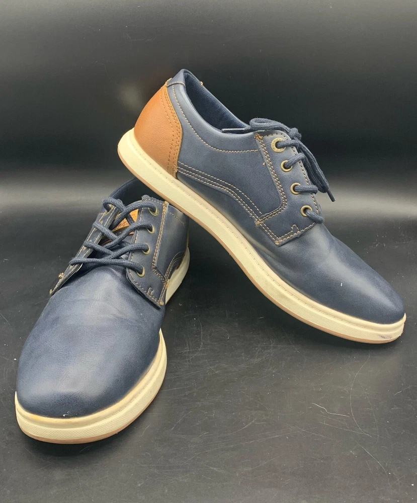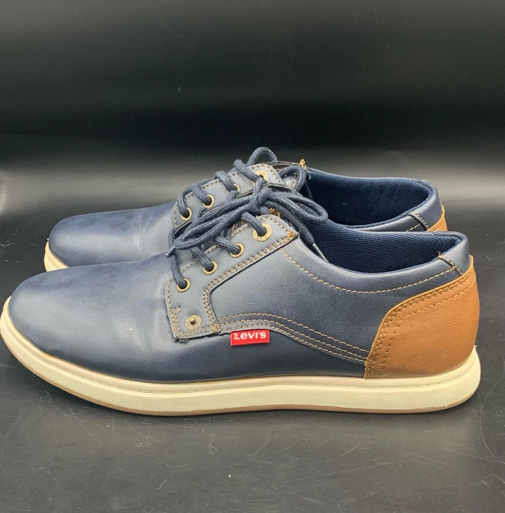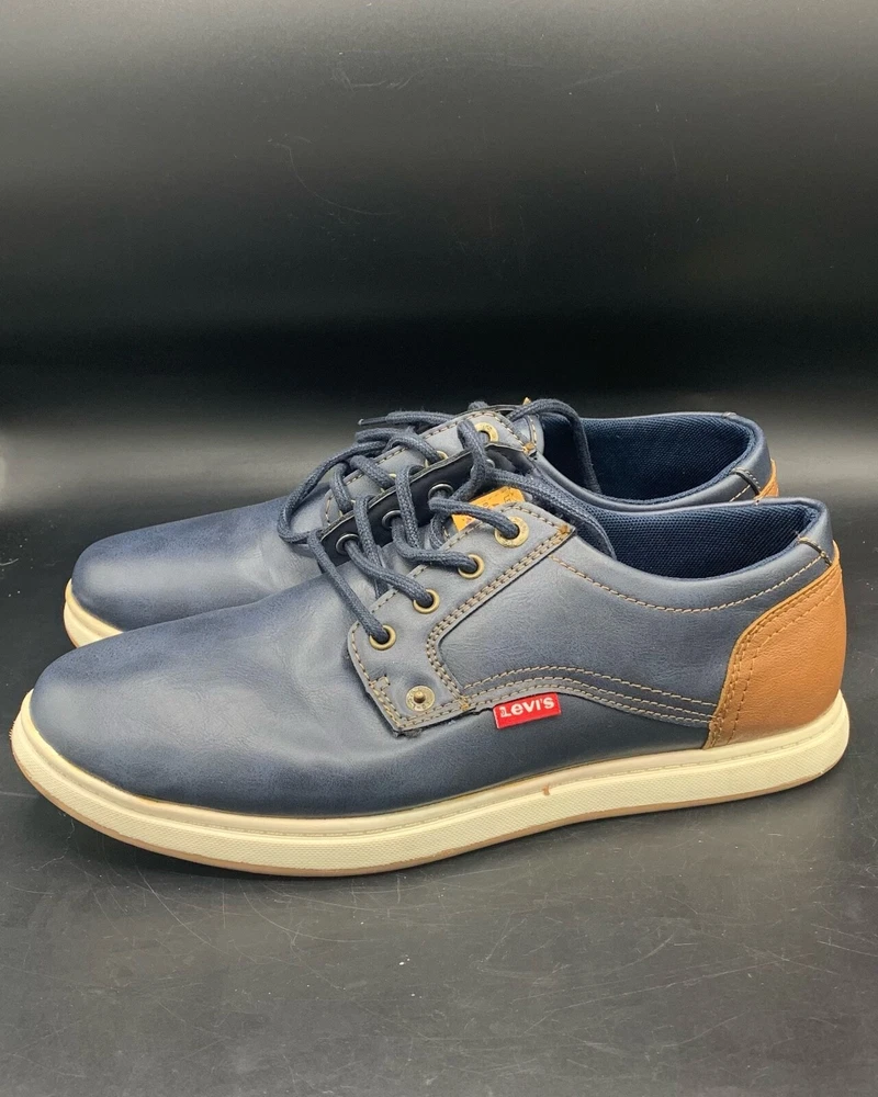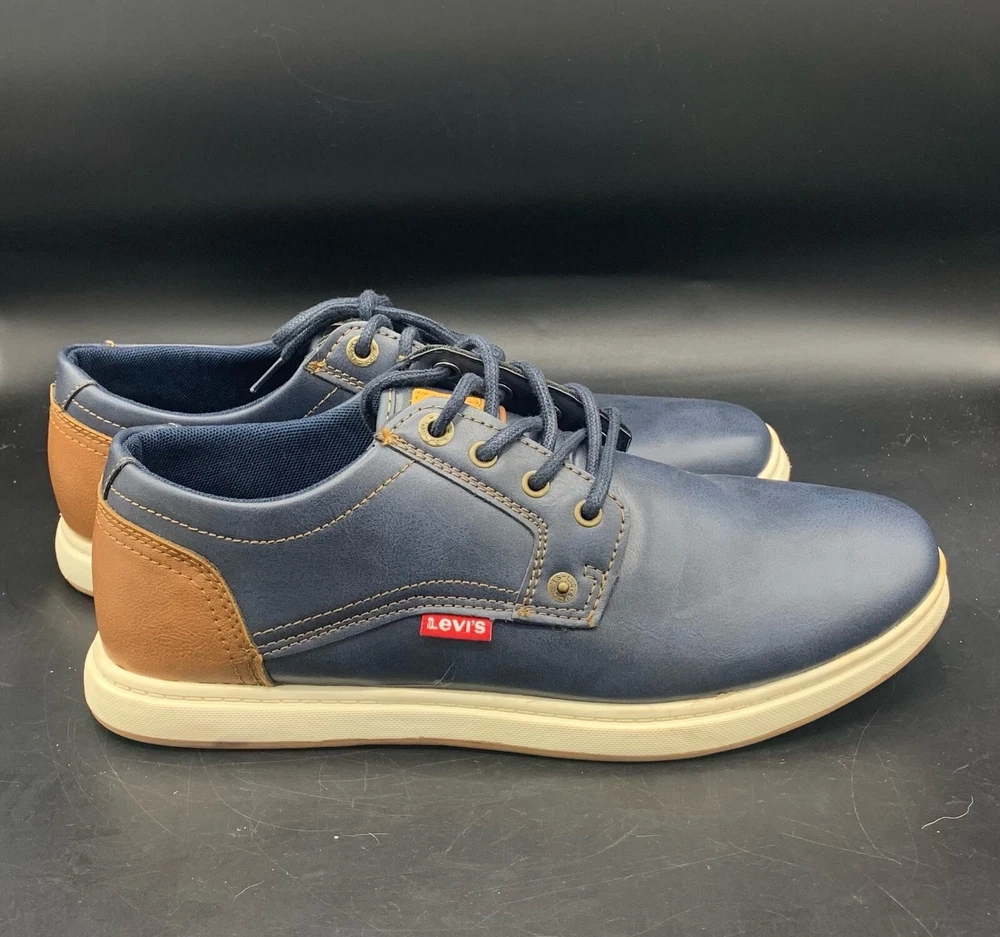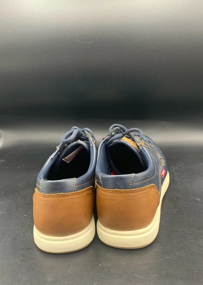 Elevate your style with these Levi's Arnold BRNSH Men's Casual Shoes. Featuring a navy and tan color combination, these sneakers are perfect for travel, workwear, and casual occasions. The round toe shape and standard shoe width ensure comfort while the rubber outsole provides durability. The blended fabric, synthetic lining, and synthetic insole material make these shoes not only stylish but also comfortable. With accents of the Levi's logo and a solid pattern, these shoes are a classic addition to any wardrobe. Available in US Shoe Size 9.5, UK Shoe Size 8.5, and EU Shoe Size 43.