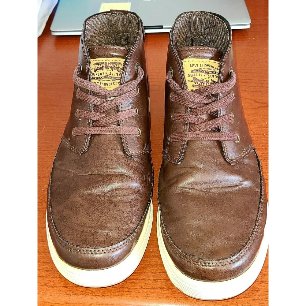 The Levi's Atwater Waxed shoe is a rare collector's item with an upside-down label. It is a casual chukka-style shoe for men with a round toe shape and lace-up closure. The shoe is made of leather and comes in brown color. It has a UK shoe size of 8.5, US shoe size of 9.5, and EU shoe size of 43. The shoe is of medium width (M) and is branded by Levi's.